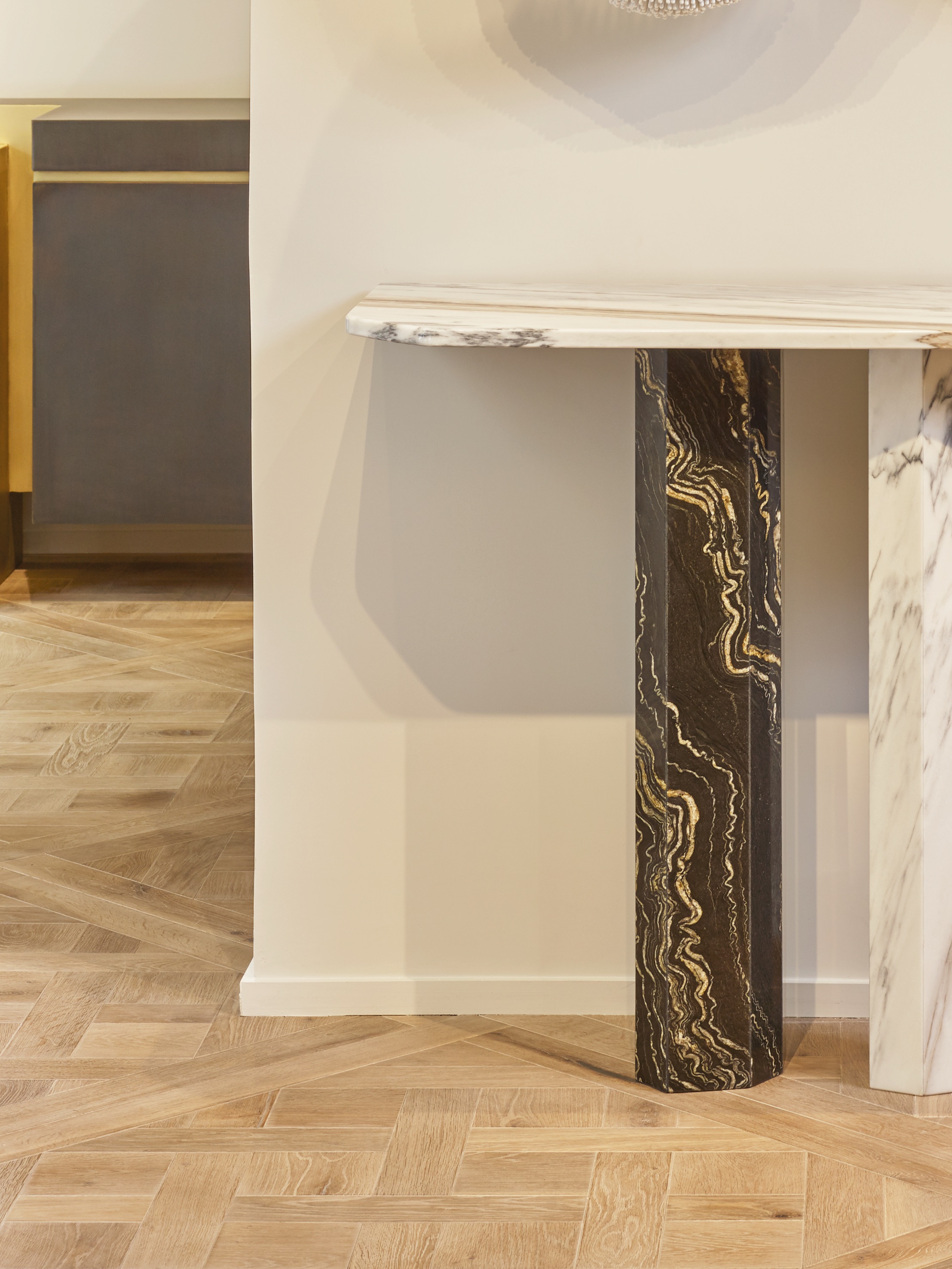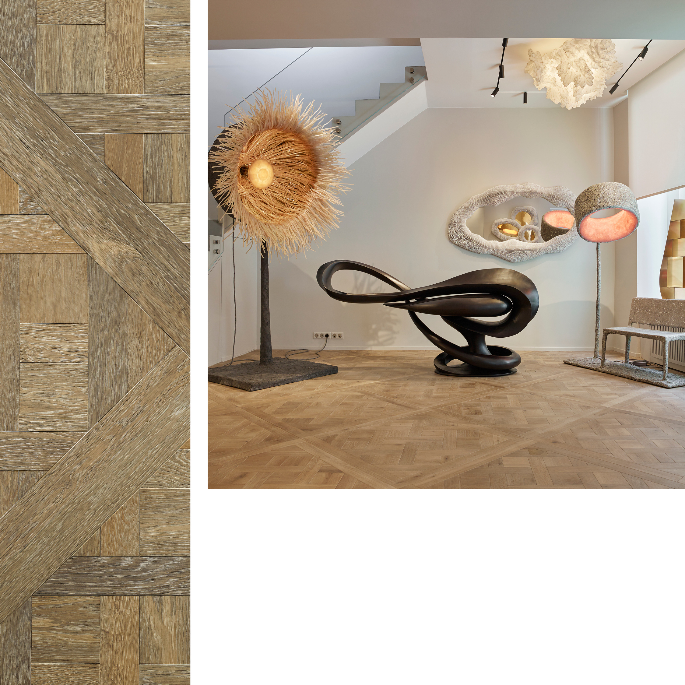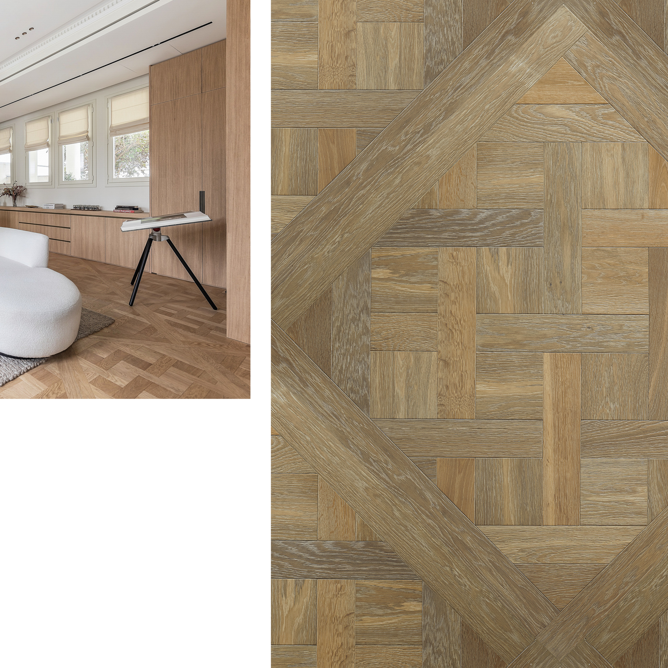 Héritage d’un passé lointain, la Dalle de Versailles fait rejaillir la splendeur des plus grands palais. Les teintes naturelles présentées ici offrent à ce motif unique un ton résolument contemporain. Nos parquets sont bien plus qu’un simple revêtement de sol : ce sont des créations signatures, issues du travail méticuleux de nos maîtres artisans.