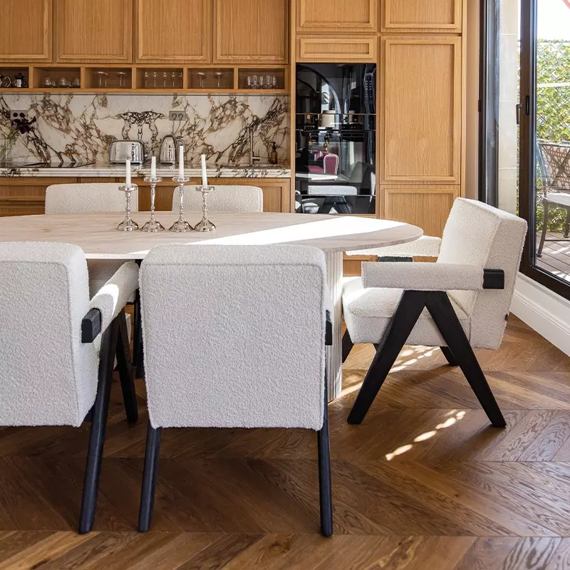 Our 'Vénitienne' collection is crafted as an invitation to creativity and freedom. The Semi-Solid Brown Fumé Smoked Oak Chevron Parquet embodies the essence of La Dolce Vita: simple and effortless elegance. Its smoky pigment, created through a unique oxidation process, envelops your interiors in a cozy and intimate atmosphere. The varnish provides the oak with a silky touch while safeguarding it from wear. The knots on the parquet's surface create a natural harmony, enhancing the connection to the outdoors. This Chevron pattern, an iconic design in parquetry, breathes life into spaces by energizing the room's ambiance. Available in a variety of patterns, you can explore different shapes, perspectives, and rhythms to craft spaces with contrasting lines using our Brown Fumé Smoked finish. Dedicated to environmental preservation, we guarantee the quality of our creations by meticulously selecting wood from sustainable and eco-friendly sources.