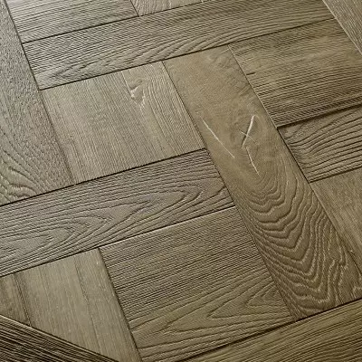 'Les Authentiques' wood floors are hand-aged and patinated through repeated oxidations, using eco-friendly water-based finishes for enhanced durability and stain resistance. The 'Coulanges' pigment is available in various patterns: straight planks, Herringbone, Chevron, and Soubise Tile.