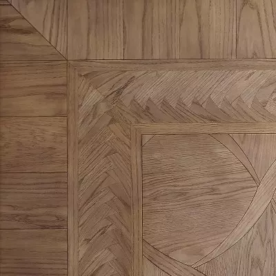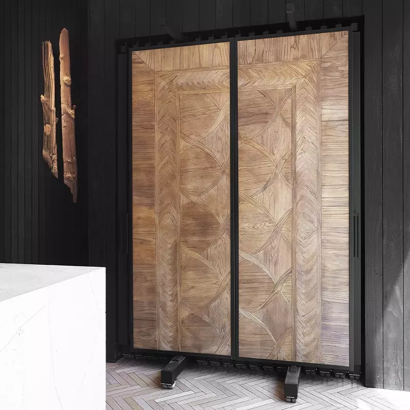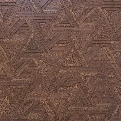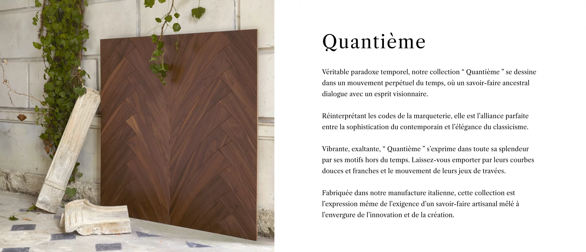 The surface responds to the light, revealing a play of shadows and textures unique to atelier marquetry. Designed for sophisticated interiors, Calypso integrates seamlessly into spaces seeking both distinction and character, blending the nobility of fine wood species with contemporary elegance.