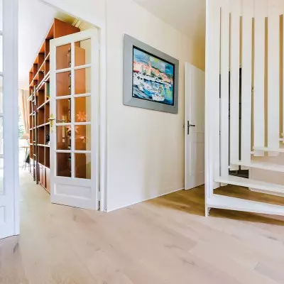 Ce plancher et sa pose à l’anglaise souligne les espaces. Sublimé par notre teinte Old Stone, celui-ci dessine la perspective de vos pièces.