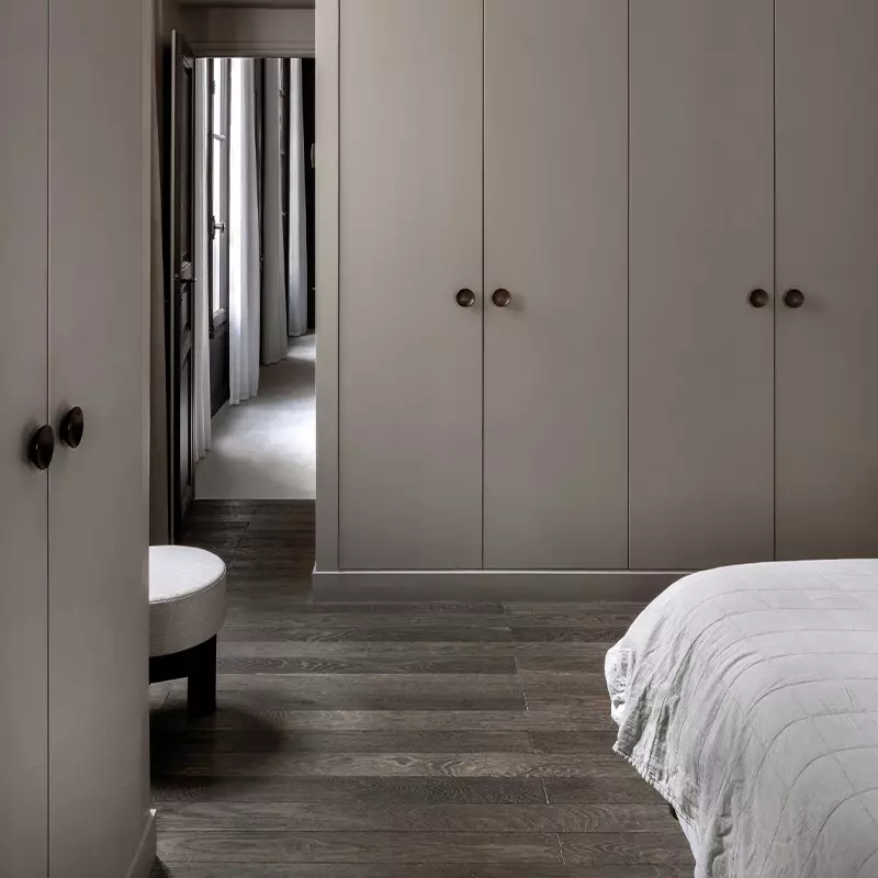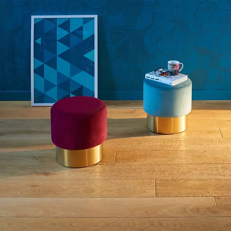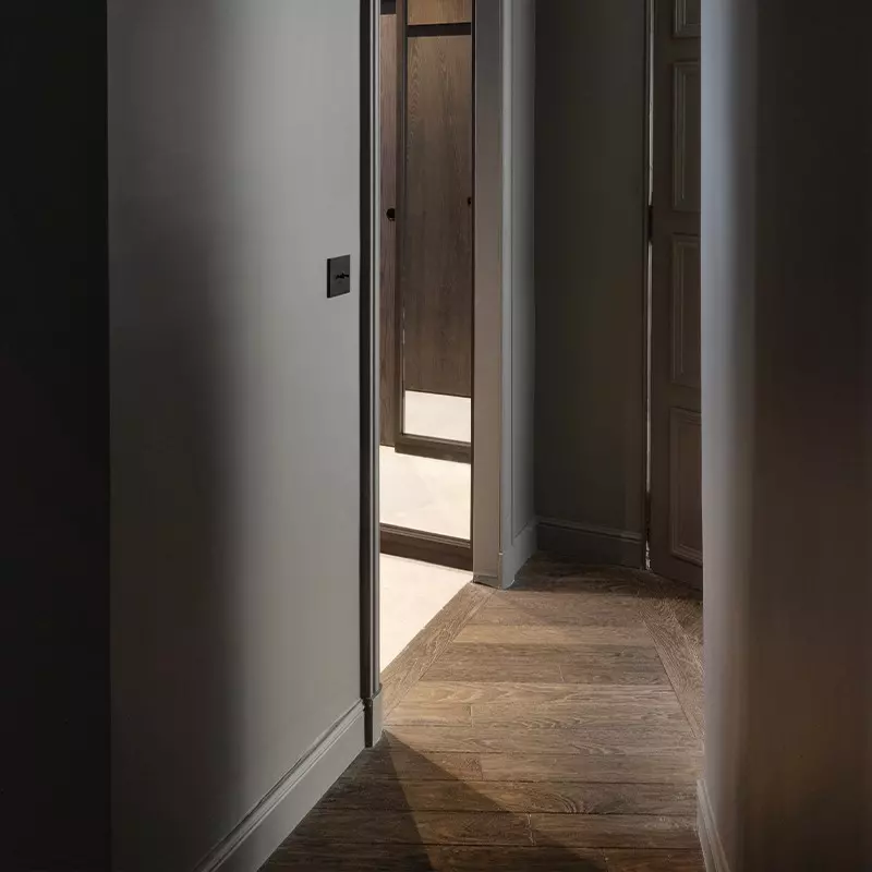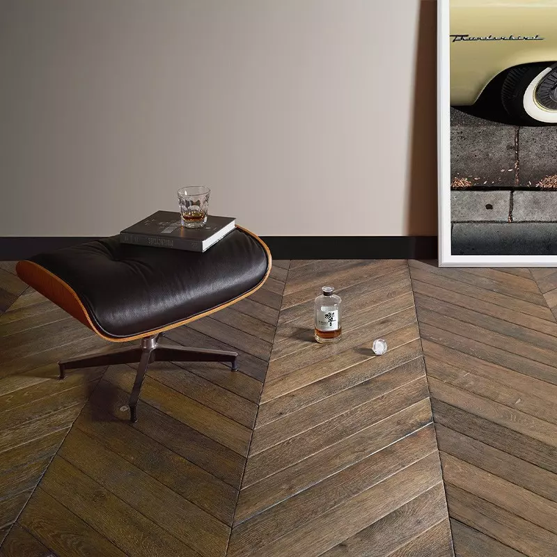Ce plancher et sa pose à l’anglaise souligne les espaces. Sublimé par notre teinte Parisien, celui-ci dessine la perspective de vos pièces.