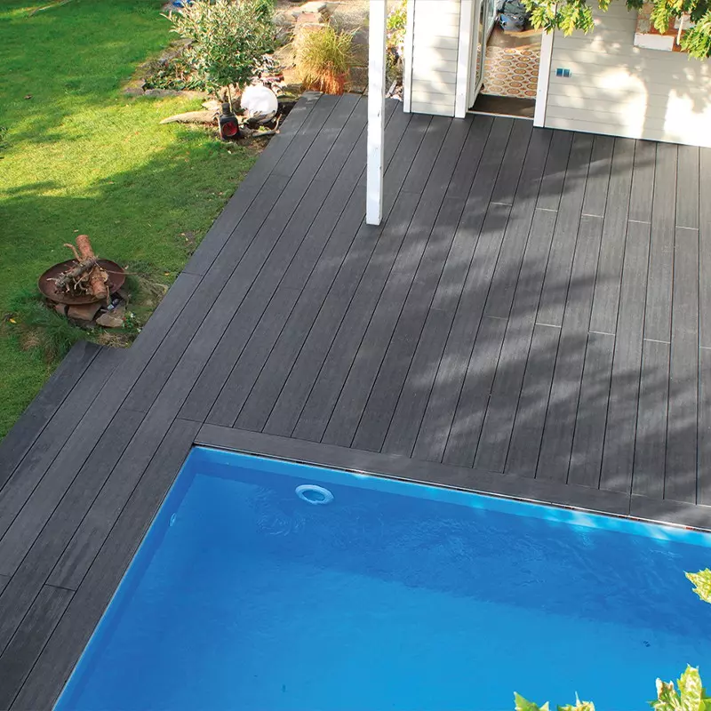 Leur teinte granit, élégante et subtilement texturée, s’intègre avec justesse dans tous les environnements : terrasses urbaines, balcons, plages de piscine ou allées de jardin.