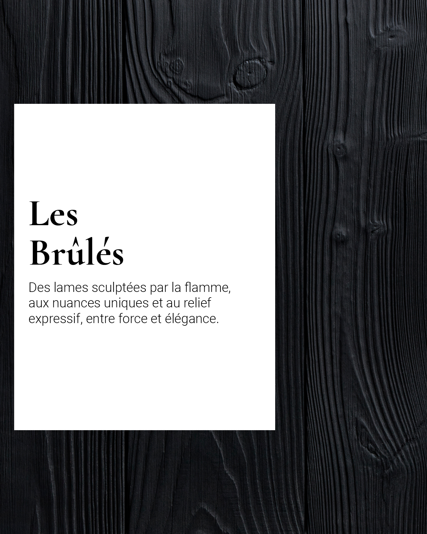 Découvrez des lames façonnées par le feu, dont le procédé inspiré des techniques anciennes sublime chaque fibre pour révéler un relief expressif et des nuances incomparables. Cette surface texturée offre non seulement un caractère visuel fort, entre ombres profondes et éclats satinés, mais confère également au bois une résistance accrue aux agressions extérieures.
