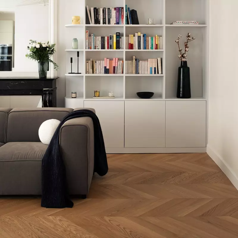 Apportez chaleur et authenticité à vos intérieurs avec le Chêne Victoire, issu de notre collection "Art de Vivre" et sublimé par sa finition vernie qui révèle toute la beauté naturelle de cette essence. Le toucher soyeux de son bois massif révélé grâce à un brossage subtil, met en lumière la finesse de chaque lame et l’élégance du motif Point de Hongrie.
