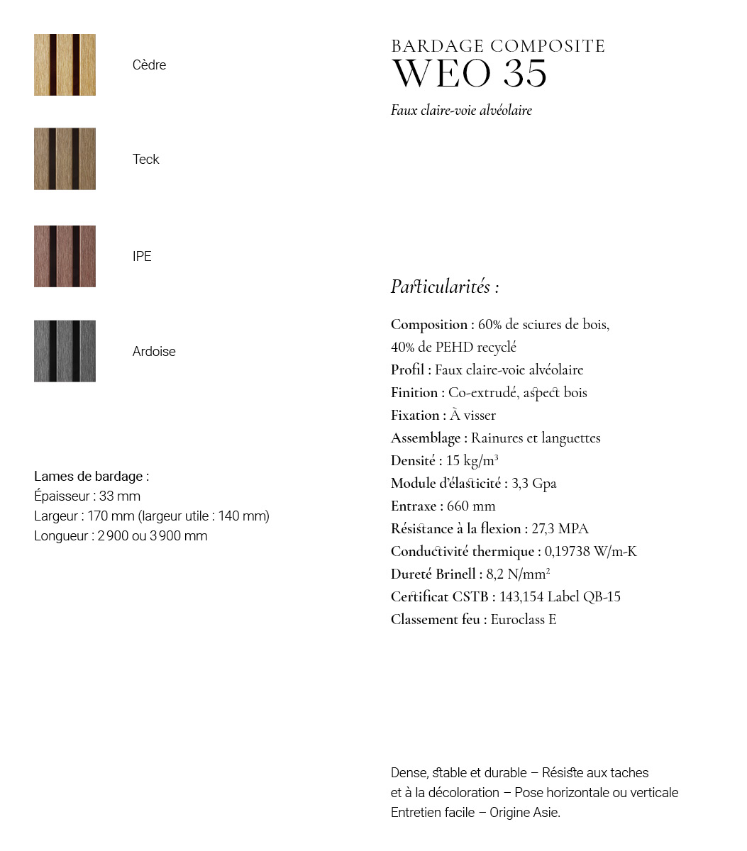 Le Bardage WEO 35 Ardoise s'adapte également à une pose sur isolation par l'extérieur, renforçant l'efficacité énergétique de votre bâtiment. De plus, les lames sont entièrement recyclables, témoignant de son engagement envers la durabilité et l'esthétique moderne.