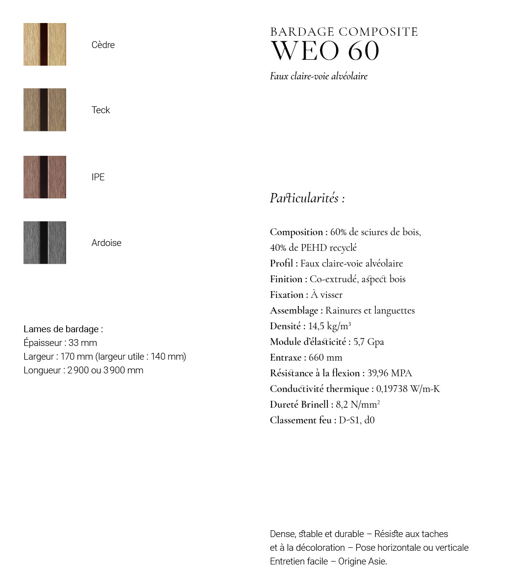 Apportez un vent de modernité à vos extérieurs avec nos Bardages Claire-voie Composite WEO 60 Ardoise et sa teinte subtile et délicate.