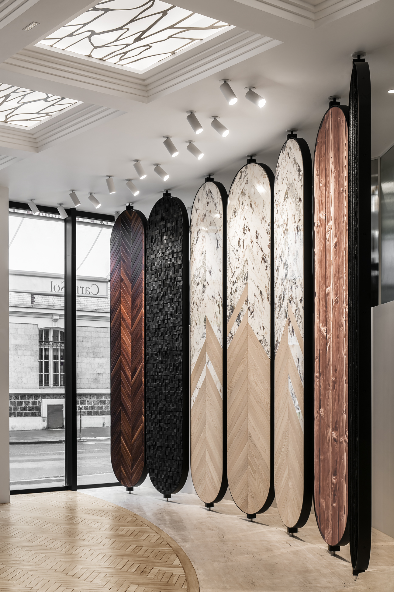 Dans un quartier baigné par l’architecture d’intérieur et l’édition, notre Showroom Louvre s’inscrit comme un outil en grande partie au service des architectes, décorateurs et designers, pour leur permettre de réaliser leur projet à la carte. Témoins des possibilités qui s’offrent à eux, d’immenses panneaux de 4 mètres de hauteur, en enfilade, accueillent le visiteur et proposent un aperçu de notre savoir-faire. Le lieu se présente comme une ode à la matière et une source d’inspiration pour tous les créateurs.