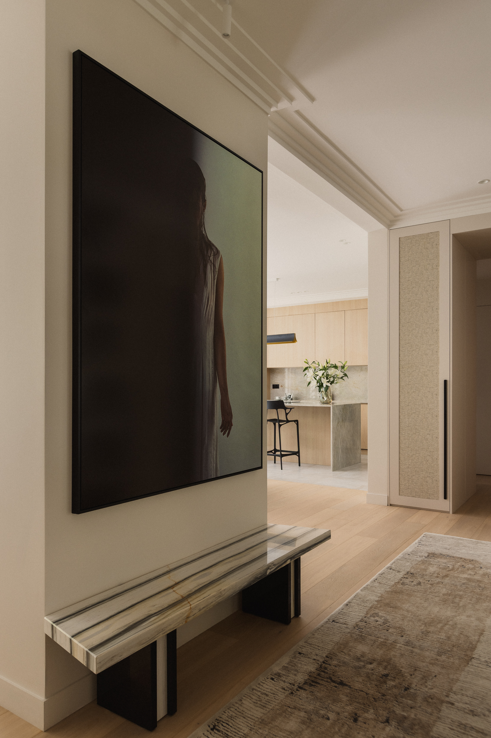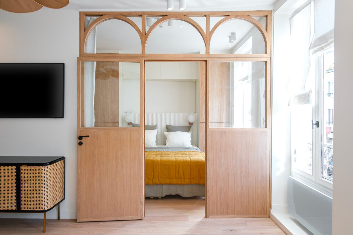 Notre Parquet en Chêne Éden, avec sa teinte naturelle et légère, sublime cet intérieur aux notes chaleureuses. Dans cet appartement, où règne une irrésistible association de bois, la douceur de notre parquet Éden vient contraster la chaleur du Noyer.