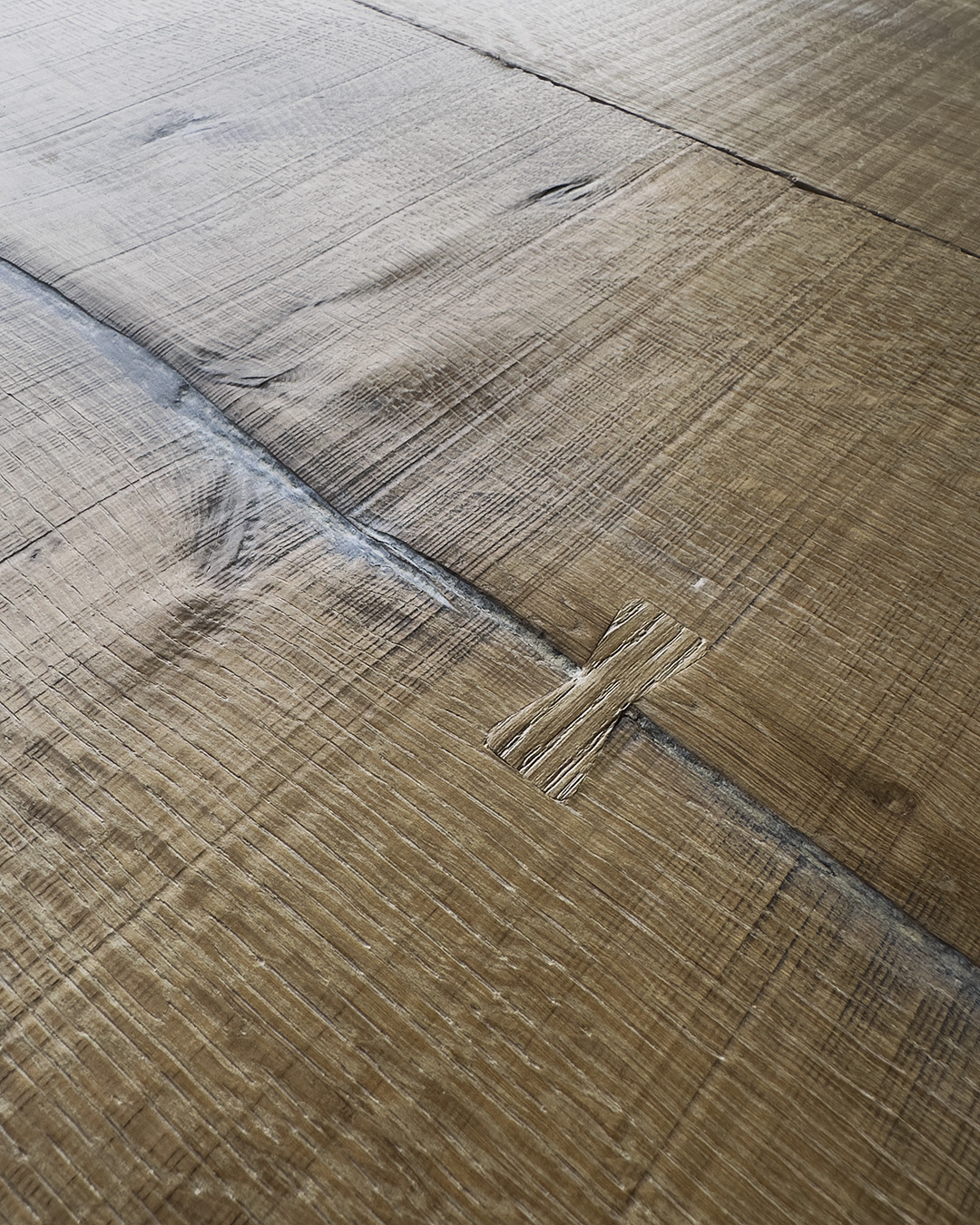 Mais ici, l’horizontalité l’emporte, le regard se prolonge, et le bois s’exprime en étirement. Les inserts “papillon”, inspirés des techniques de restauration traditionnelles, ornent ici les fissures du bois en leur conférant caractère et singularité.