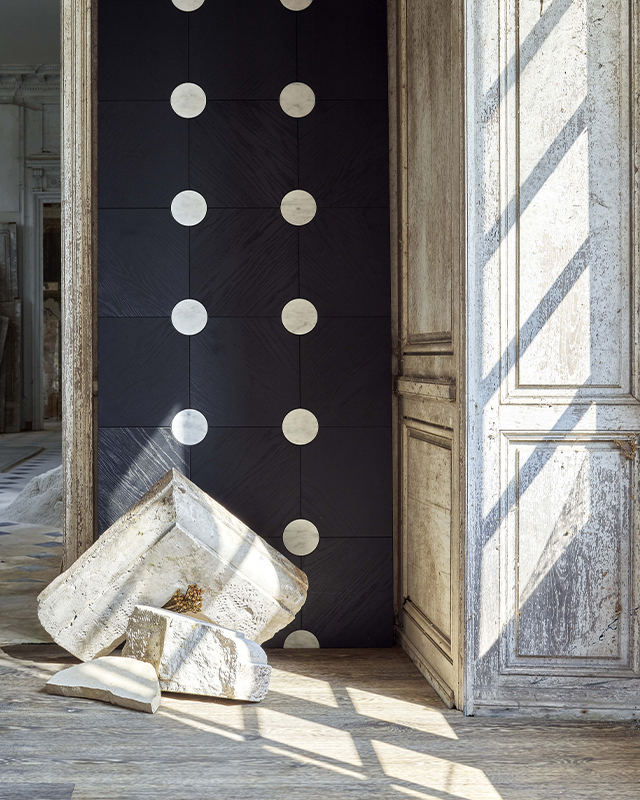 D’un dialogue naît l’envie de faire vivre le “ Médaillon ” en créant une collection basée sur une déclinaison d’essences nobles et d’incrustations de marbres.