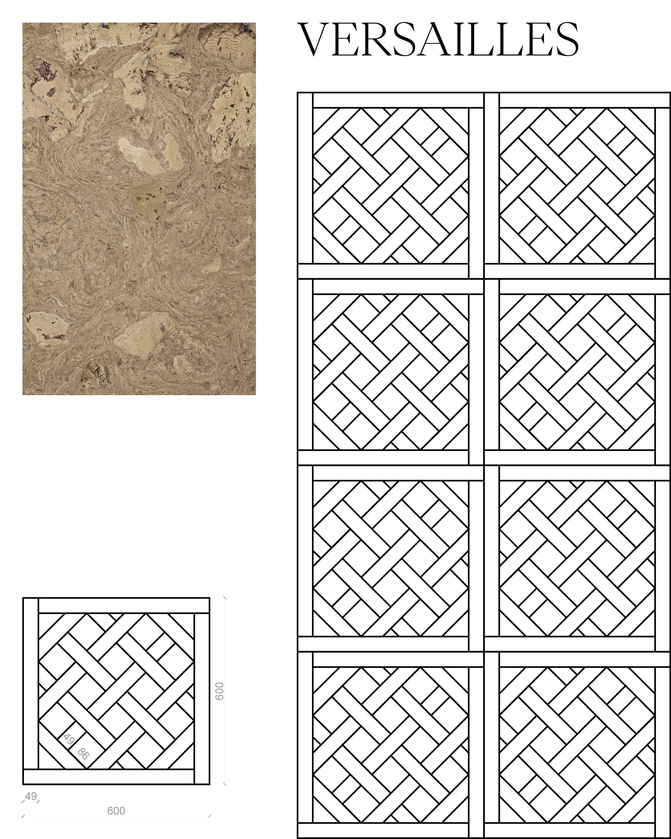 La surface est ensuite poncée, teintée, puis protégée par un vernis durci aux UV, qui garantit sa résistance à l’usure, aux taches et au temps. La découpe finale assure un calepinage précis et élégant, fidèle au langage graphique de la Maison.