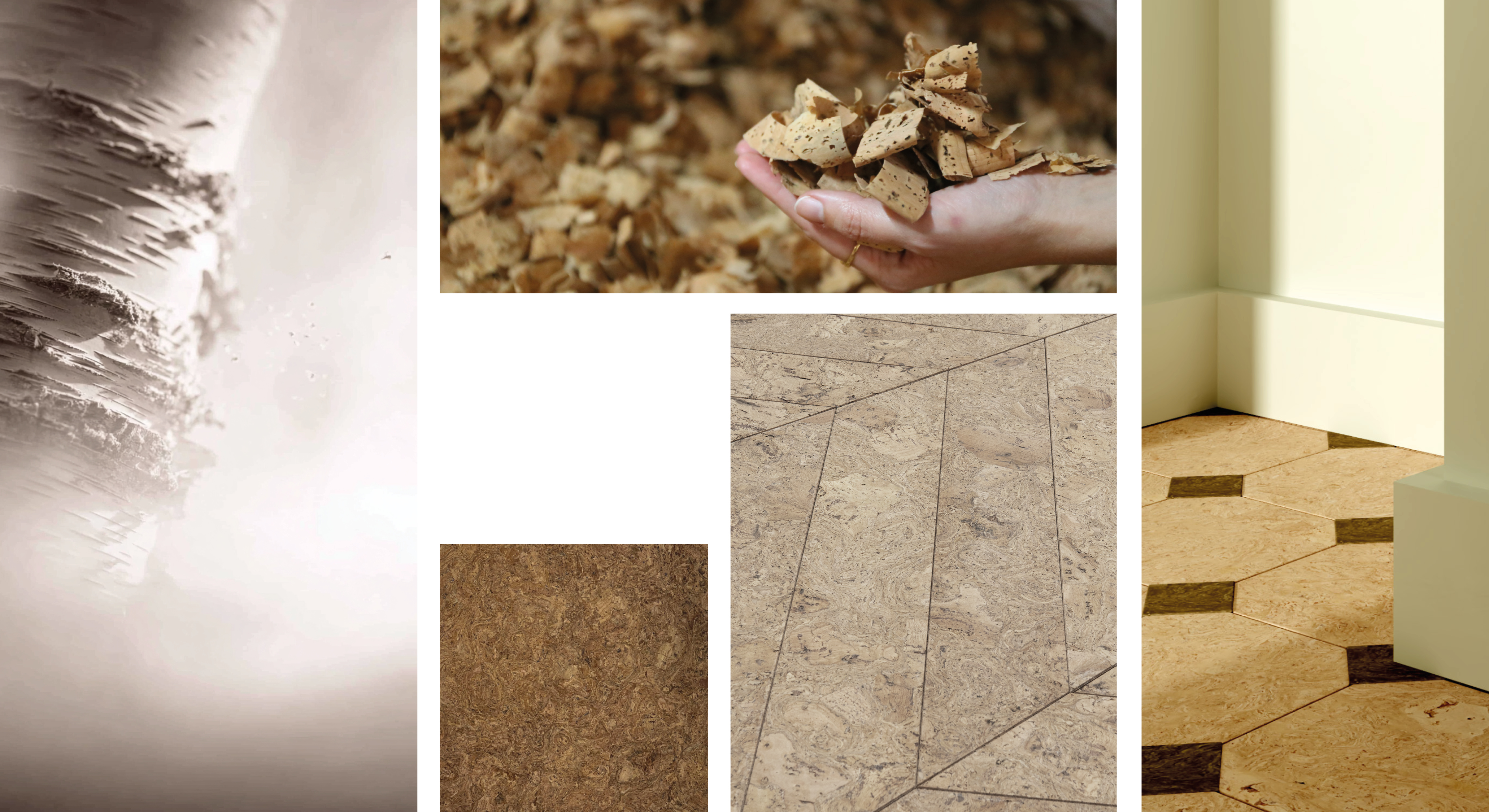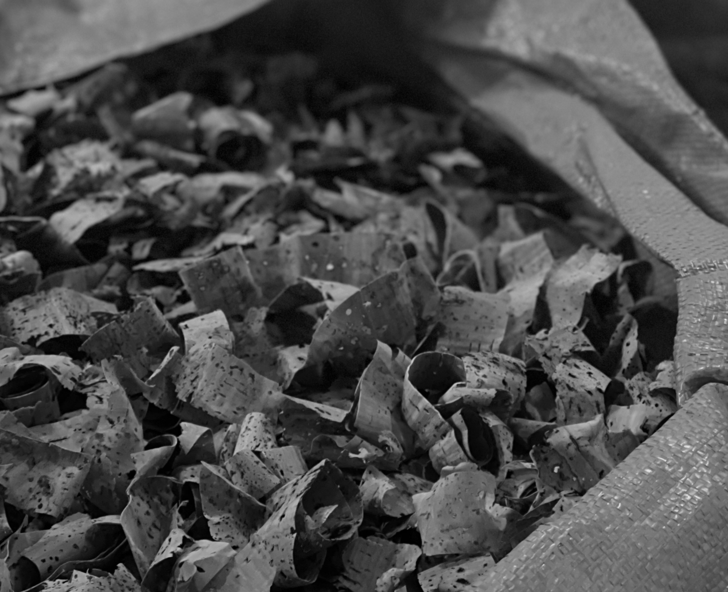 L’écorce, est d’abord récoltée à la main, puis séchée et stabilisée. Elle est ensuite compressée à chaud : cette étape clé densifie la matière et lui apporte stabilité, singularité et fait émerger sa minéralité.
