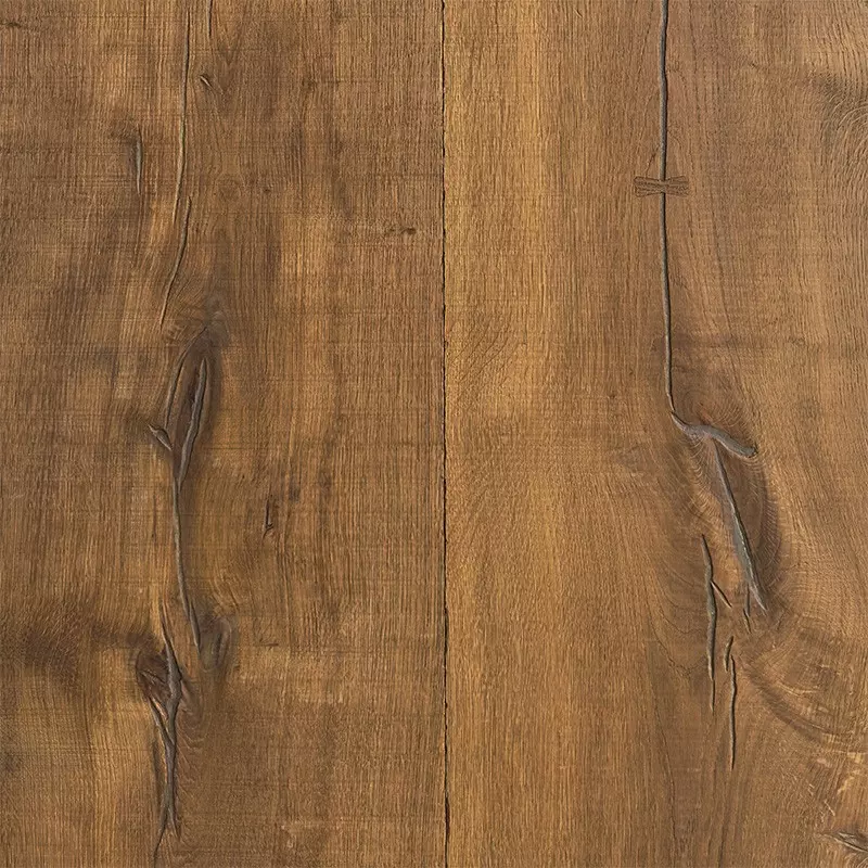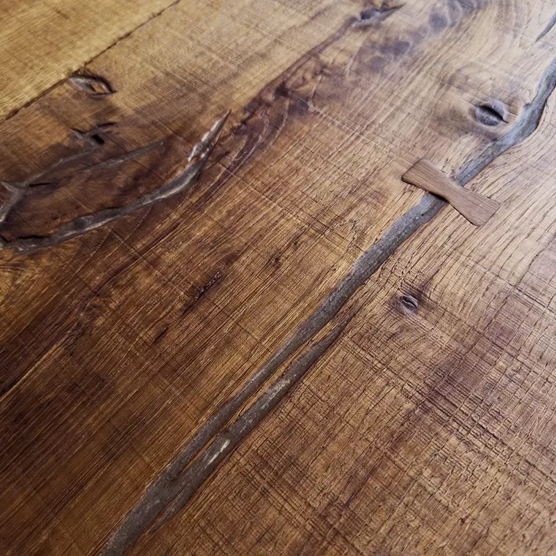 Pensée pour dilater l’espace, la pose en lames longues crée un effet d’horizontalité fluide, apportant sérénité et structure aux volumes. Certains éléments intègrent des inserts "papillon" inspirés des techniques anciennes de restauration, venant renforcer les fissures naturelles tout en signant un caractère artisanal et authentique.
