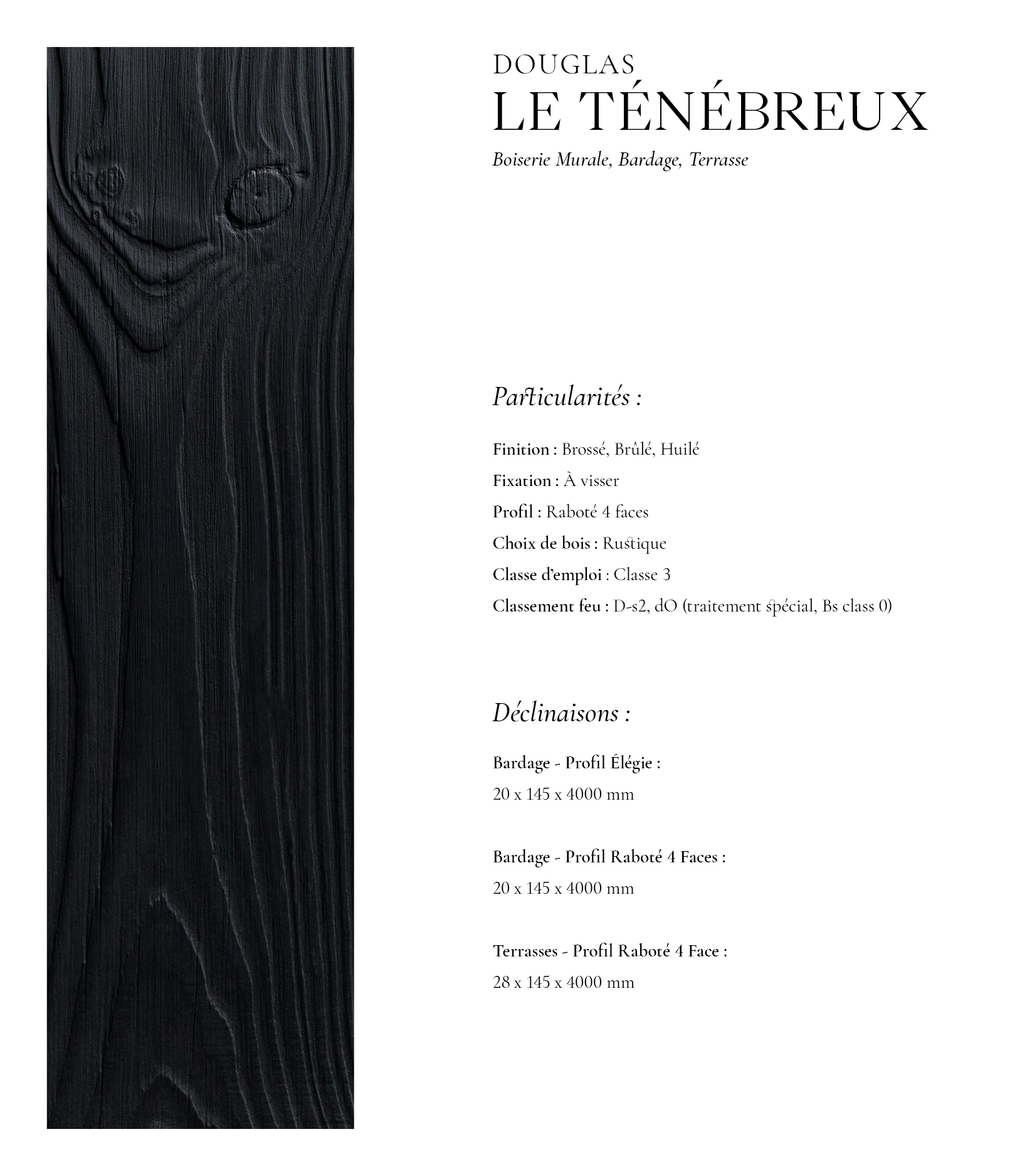 Notre Ténébreux, issu de la collection "L'Outrenoir", un Bardage en Douglas brûlé et brossé incarne une esthétique sobre et raffinée, où la matière se fait texture et lumière. Sa teinte noir intense aux reflets organiques révèle un bois travaillé avec précision, entre force du feu et délicatesse artisanale.