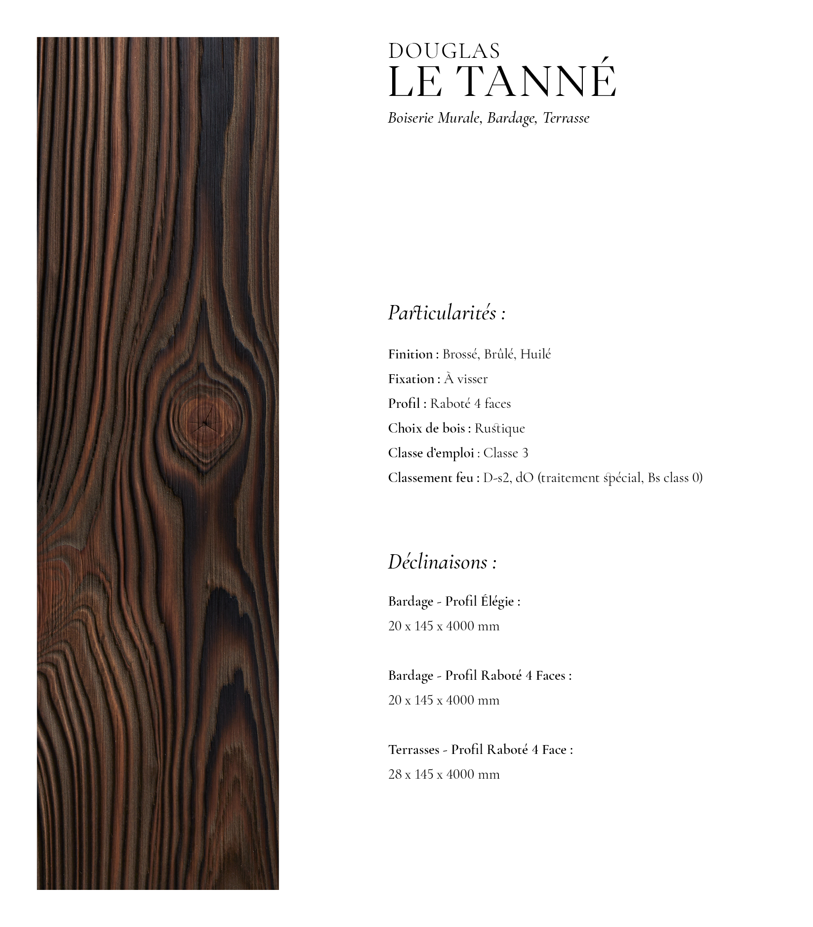 Le Tanné, un savoir-faire ancestral au service de l'architecture. Découvrez notre collection "L'Outrenoir" et notre Bardage en Douglas Brûlé Brossé. Ses nuances naturelles intenses et subtiles magnifient l'espace dans un jeu de clair-obscur captivant.