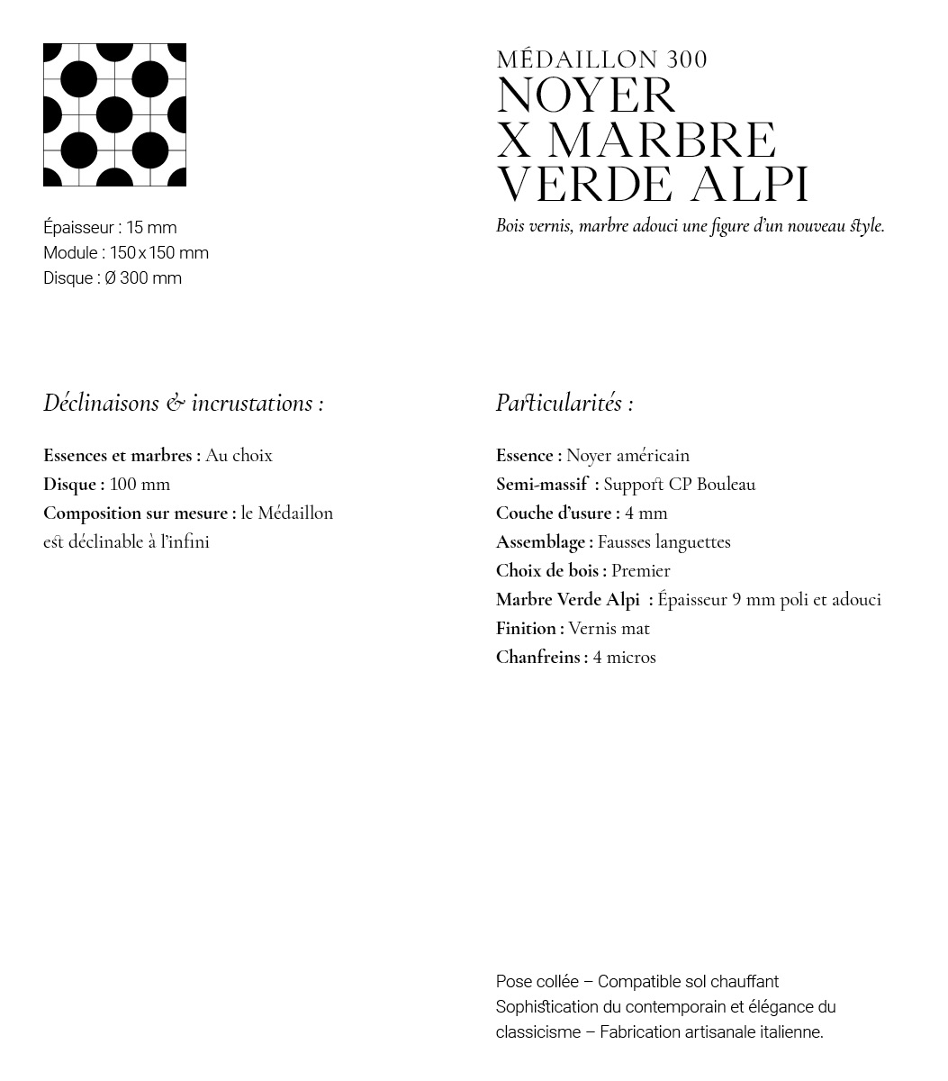 • Medaillon Noyer U.S incrustation Marbre Verde Alpi - 15x300 - choix confort - realisation 01 - carresol