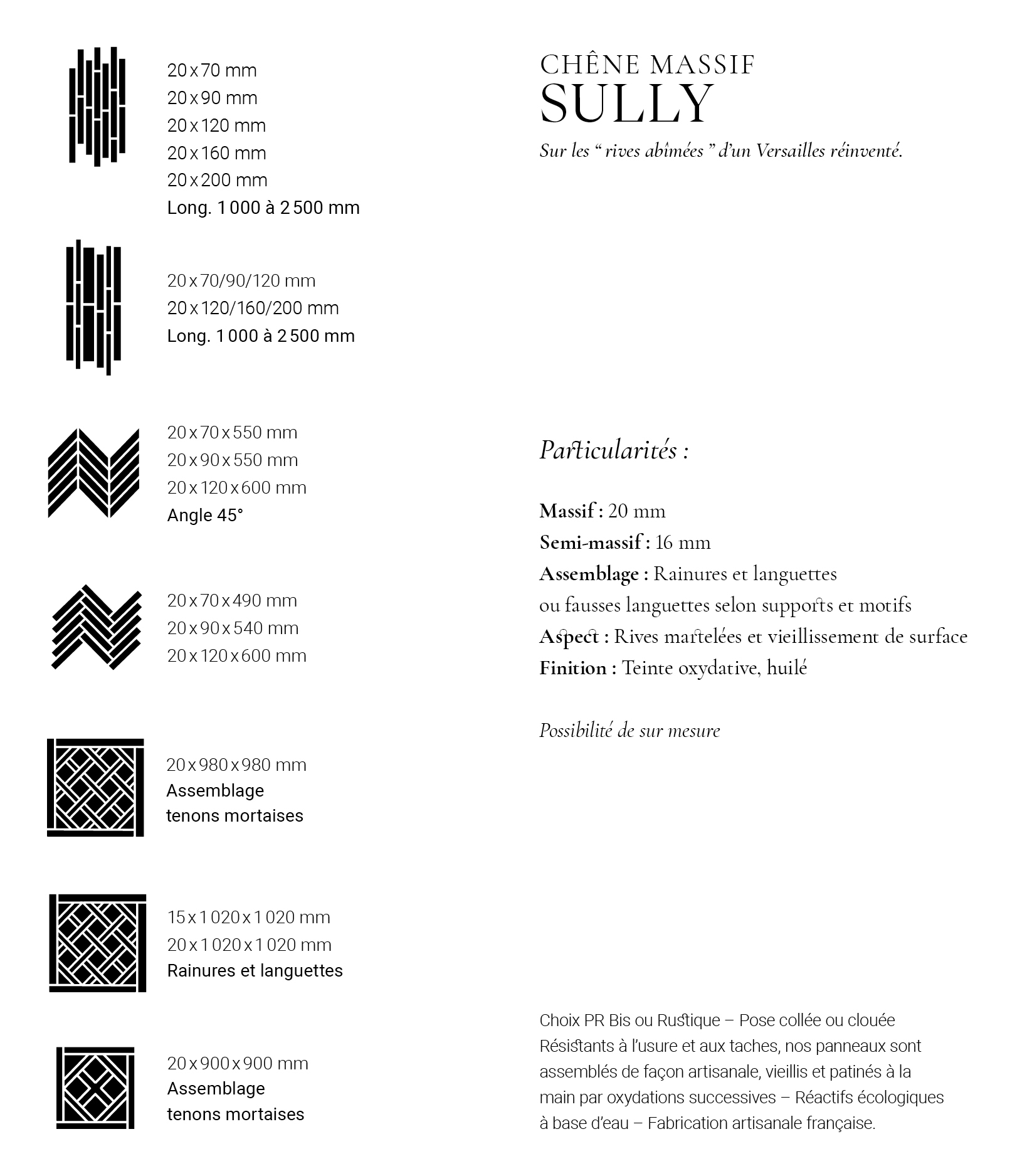 Notre pigment « Sully » se décline en divers motifs : lames droites, Bâton Rompu, Dalle de Versailles et Dalle Soubise.
