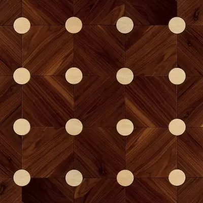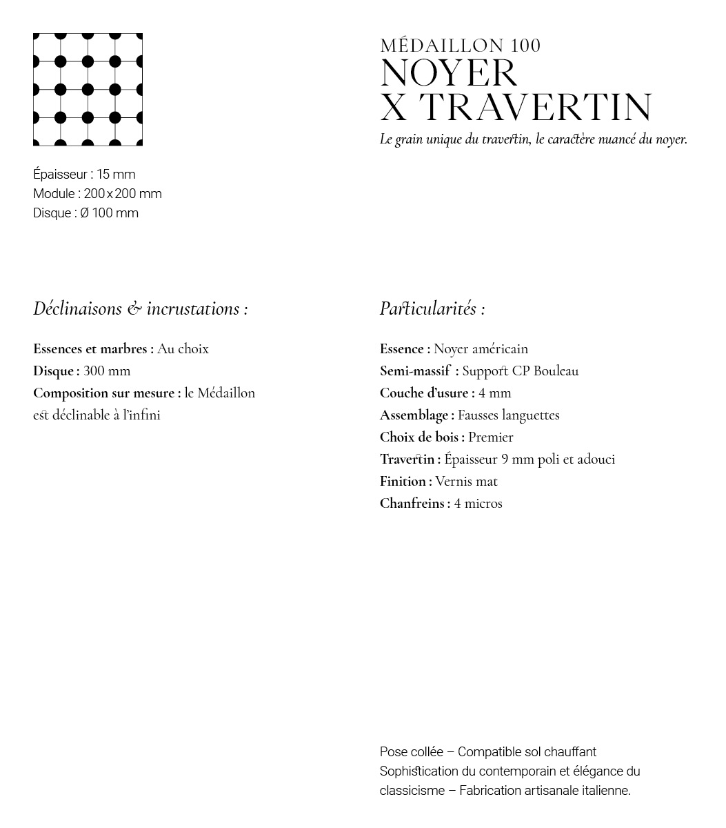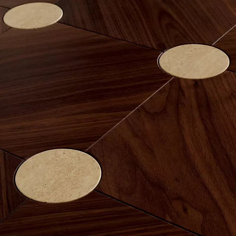Le cercle central qui aura inspiré son nom, est déclinable en diverses essences ou incrustations minérales. Découvrez ici l’association du Noyer avec le Travertin. La rencontre de ces matières nobles crée un sentiment d’harmonie et de plénitude sans pareil. La chaleur véhiculée par le bois et la pierre résonne dans toute la pièce. Ses disques en 100 mm de diamètre offriront à vos espaces une dimension singulière et surprenante.