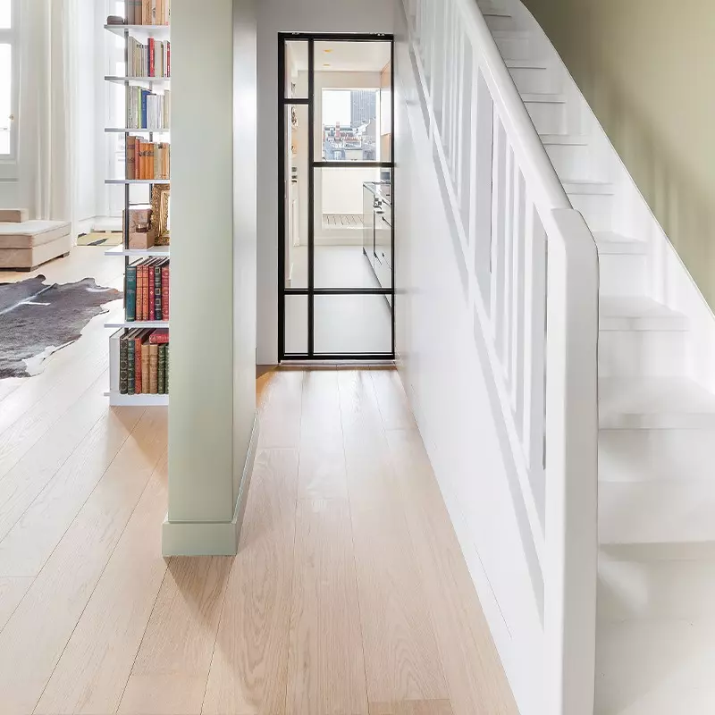 Notre Chêne Essence Contrecollé se décline en Bâton Rompu, Point de Hongrie, et comme présenté ici en lames droites. À partir d’une seule teinte, vous pourrez donc à loisir la décliner en une infinité de combinaisons.