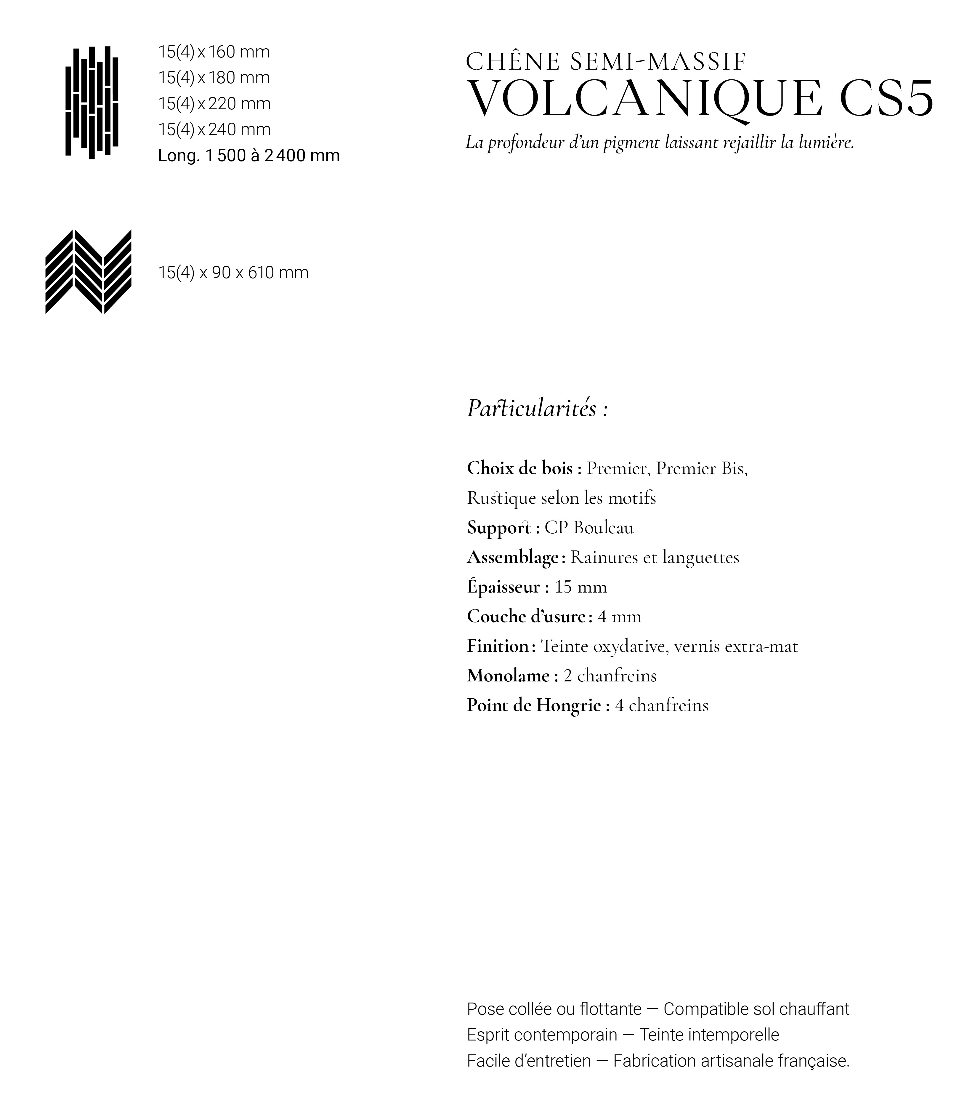 Façonné à la main par nos maîtres artisans, notre Chêne Volcanique CS5, et son pigment aux nuances profondes, confèreront à vos intérieurs une sensation de chaleur et de bien-être absolu. Son brossage et son vernis extra-mat subliment cette teinte tout en épargnant la matière de l’usure.