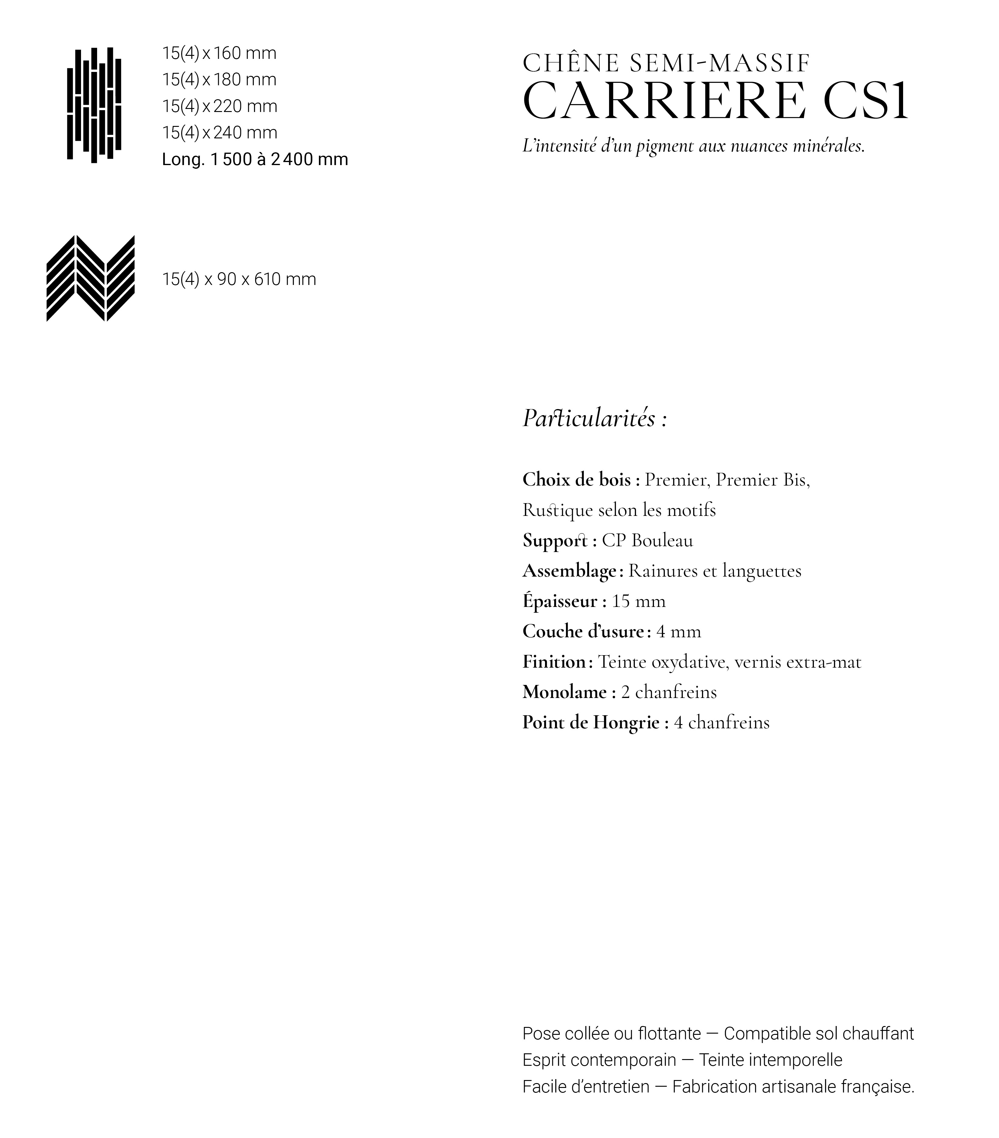 Façonné à la main par nos maîtres artisans, notre Chêne Carrière CS1, et son pigment aux notes minérales, confèreront à vos intérieurs une ambiance empreinte de sérénité. Son brossage et son vernis extra-mat subliment cette teinte tout en préservant le bois de l’usure.