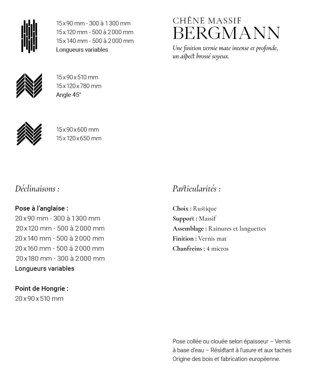 Notre Bâton Rompu en Chêne Massif Bergmann et ses nuances profondes et chaleureuses sublimeront votre décoration d'intérieur en lui insufflant une atmosphère intime et sereine. Son brossage artisanal confère au bois un toucher soyeux tandis que sa finition vernie le protègera durablement contre l'usure et les éraflures.