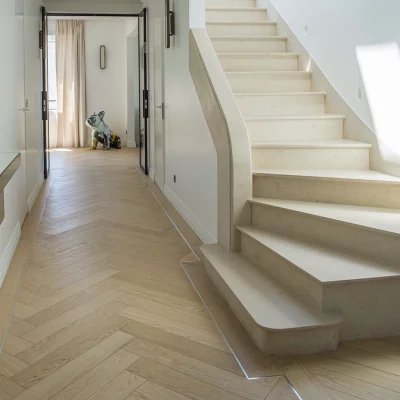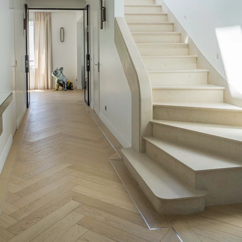 • Parquet bâton rompu Chêne Riviera, réalisation d'une entrée avec escalier magistral