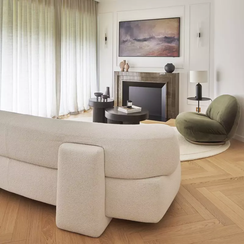 Notre Chêne Riviera Contrecollé se décline en Monolame, Point de Hongrie, et comme présenté ici en Bâton Rompu. À partir d’une teinte raffinée, laissez libre cours à votre créativité en explorant une multitude de combinaisons infinies.