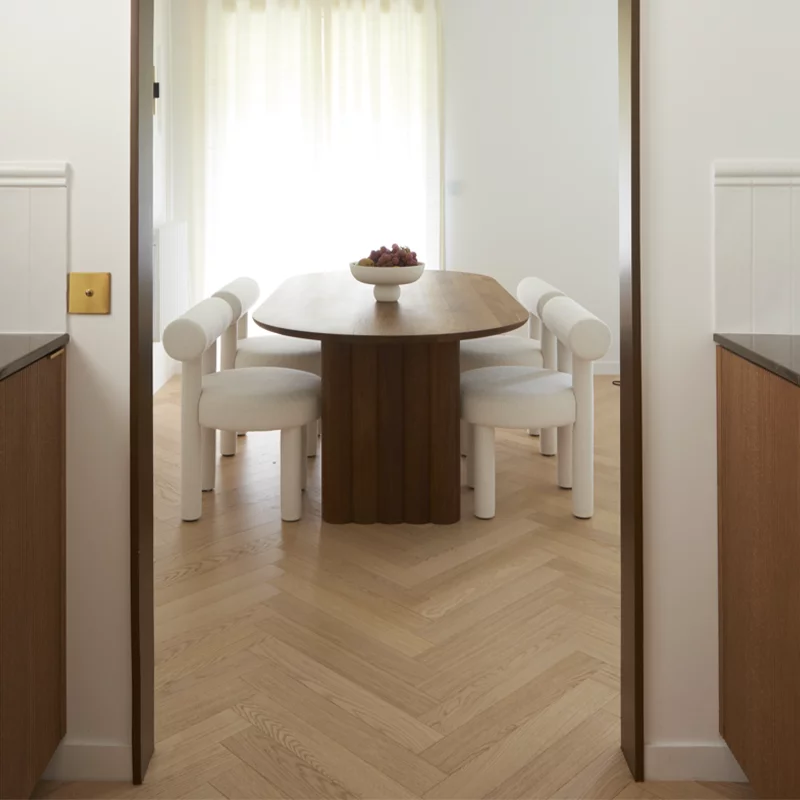 • Bâton rompu Chêne Riviera, shooting réalisé dans un appartement avec cuisine ouverte sur l'espace salle à manger