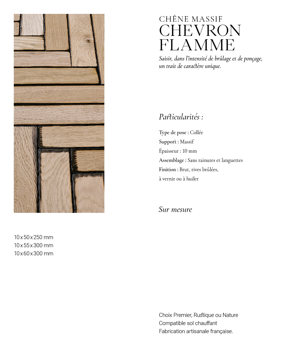 Ses rives brûlées soulignent avec subtilité ce motif iconique de la parqueterie en lui conférant un aspect résolument contemporain. Sa finition brute vous offre la possibilité de lui apporter la finition celle que vous souhaitez. L’intensité de son brûlage est ajustable à la pose selon vos projets.
