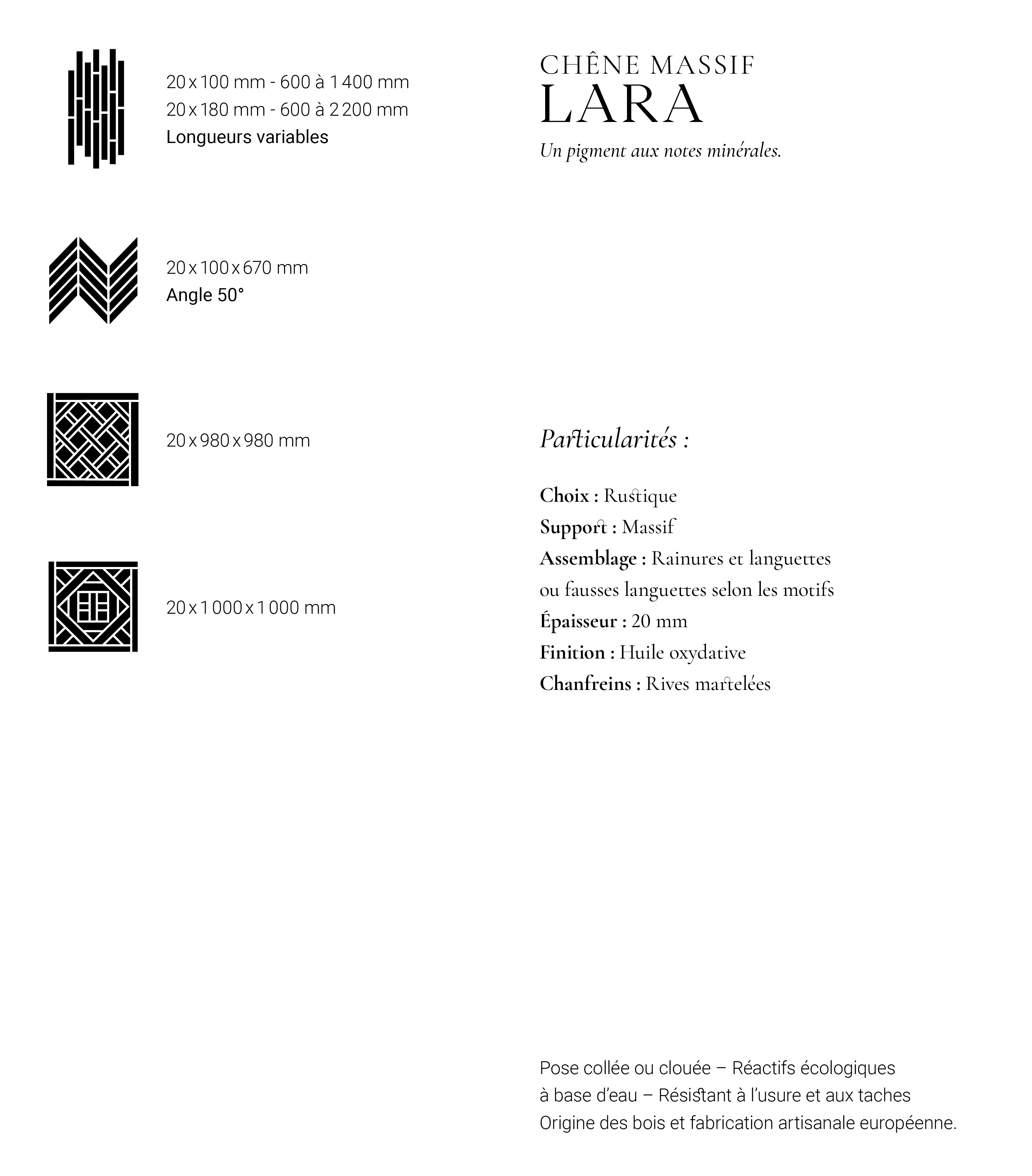 L’Aremberg, motif iconique de la parqueterie, nous transporte dans un autre temps. Magnifié par notre teinte Lara, celui-ci devient alors un symbole à la fois d’intemporalité et de modernité.