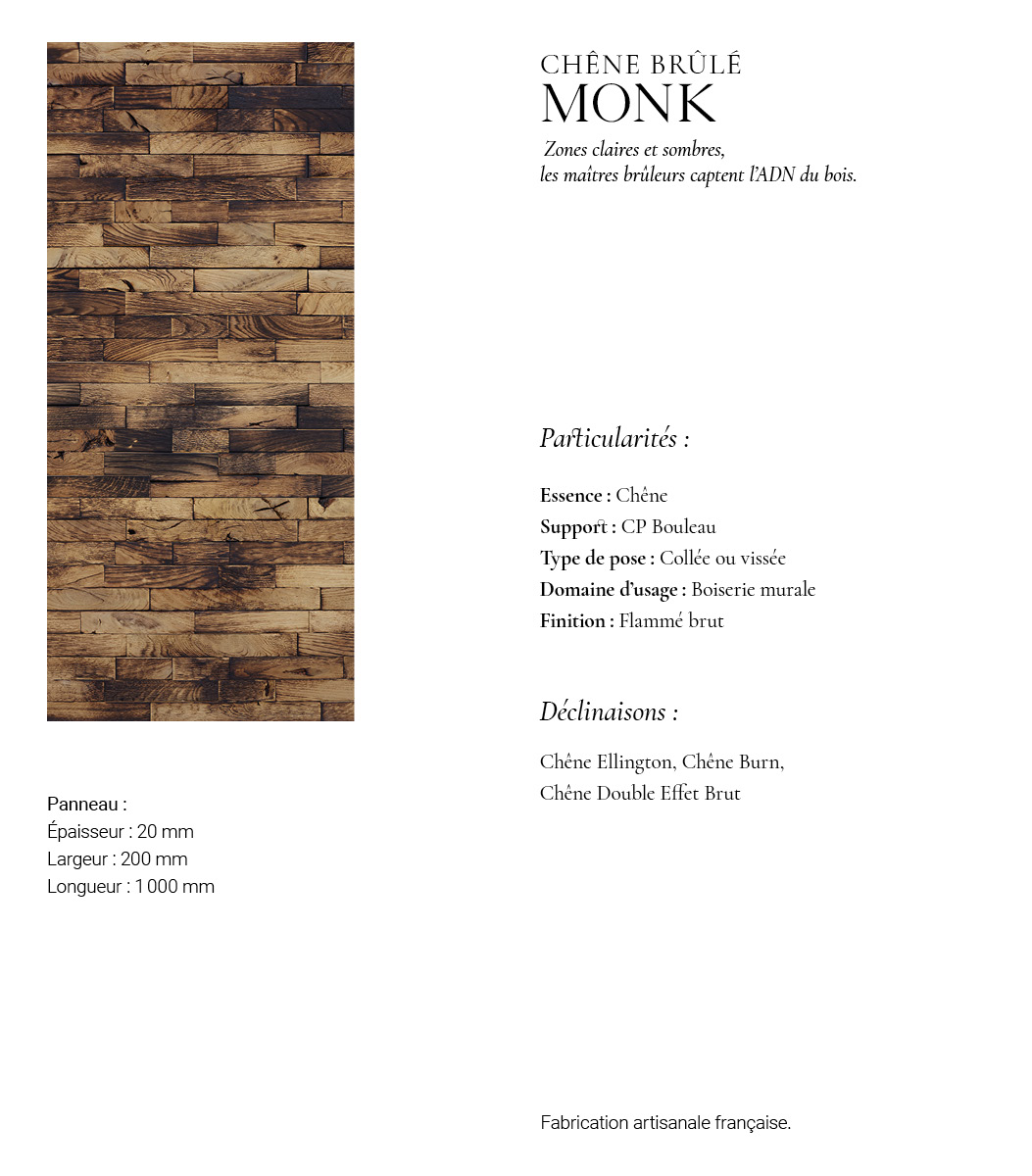 Offrez à vos intérieurs des revêtements muraux aux lignes singulières grâce à notre collection « Maître de l’Outre Noir » et notre Panneau Décoratif en Chêne Monk en bois brûlé.