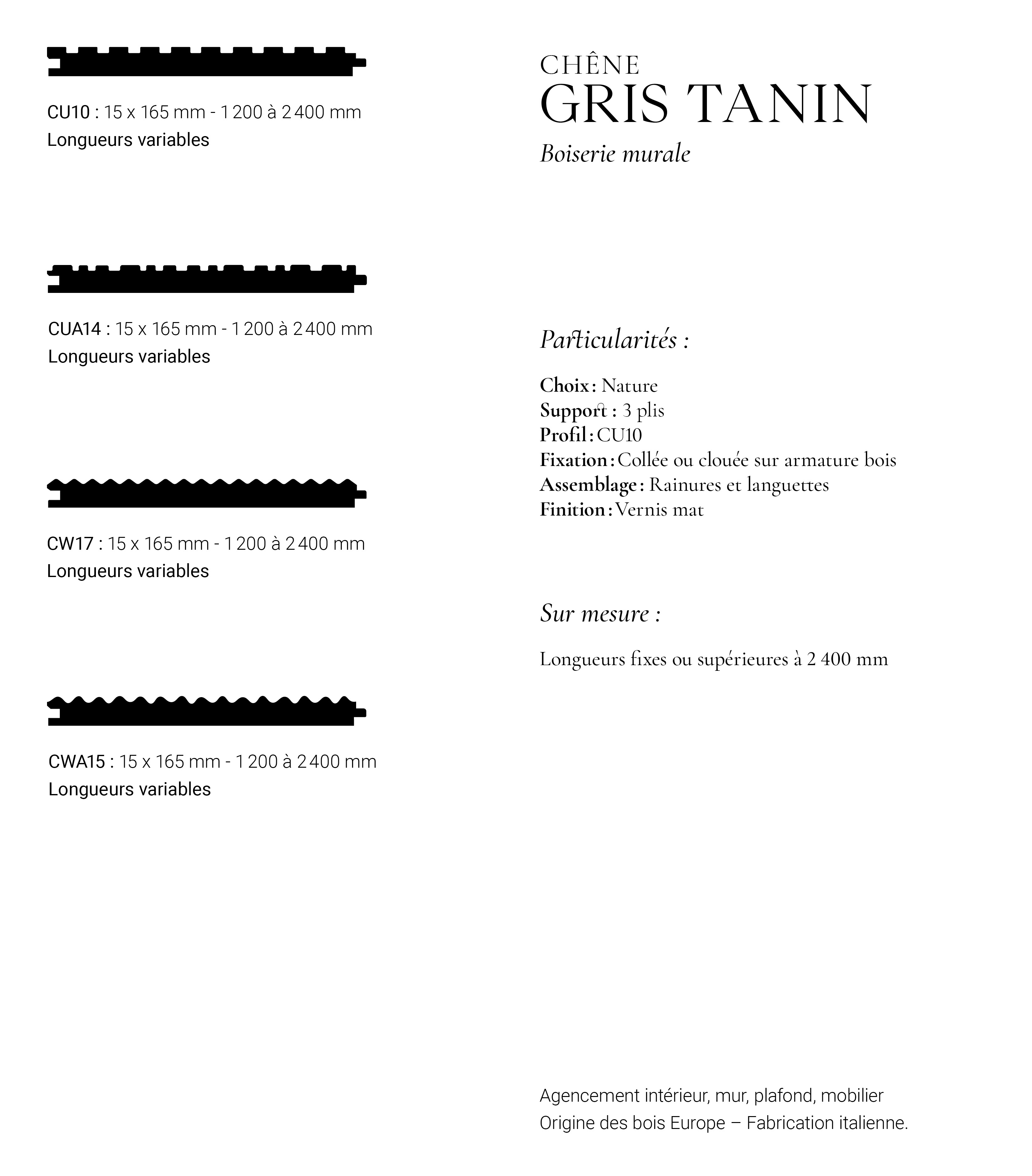 Boiserie Murale Gris Tannin Vernis 15x165 mm - Choix Select - Vue de face - CarreSol