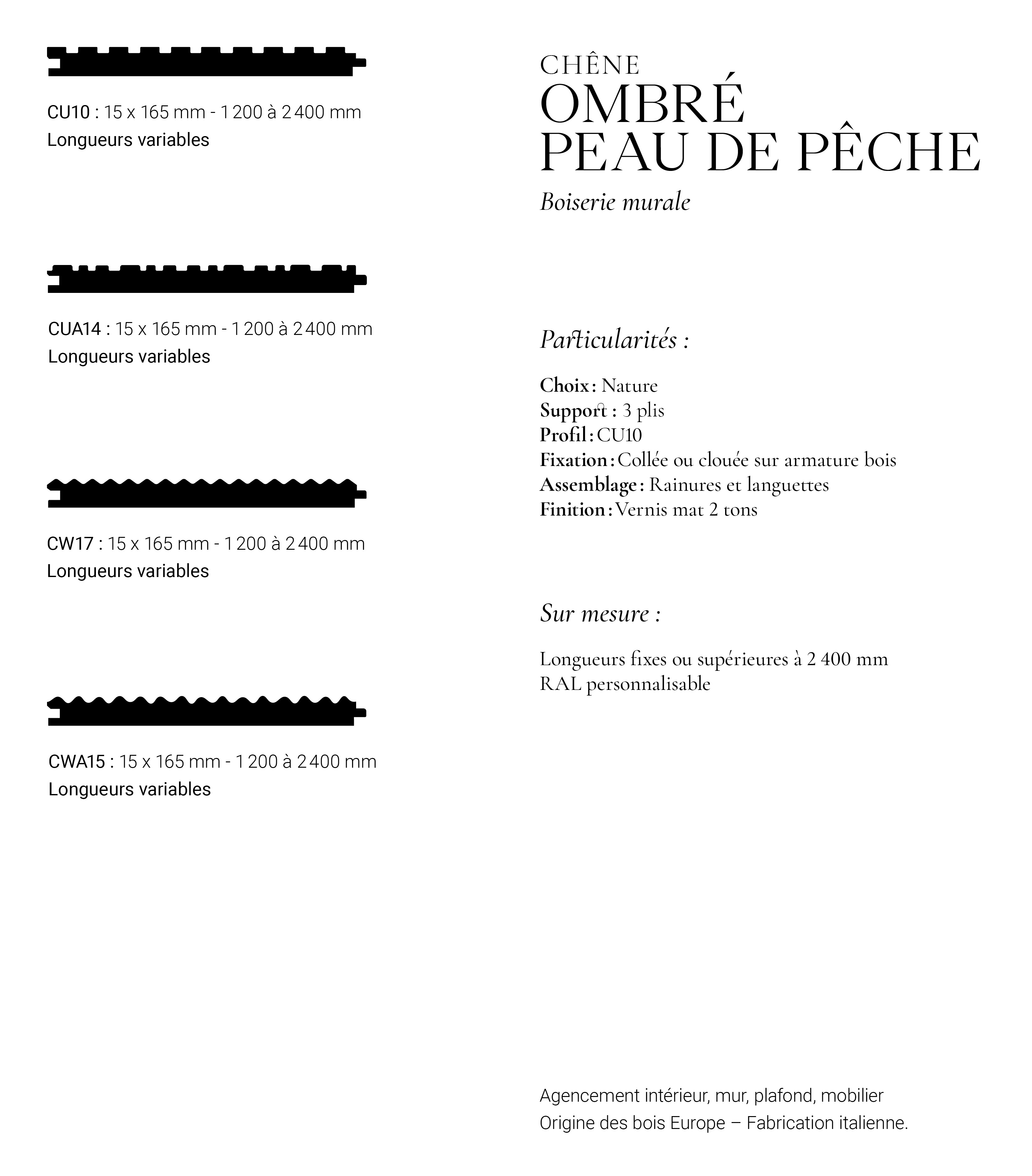 Conçu à partir de Chêne Européen, sa teinte Ombrée Peau de Pêche, propage dans vos espaces une aura poétique. Son vernis, exalte le veinage noble du bois tout en lui octroyant une protection durable.