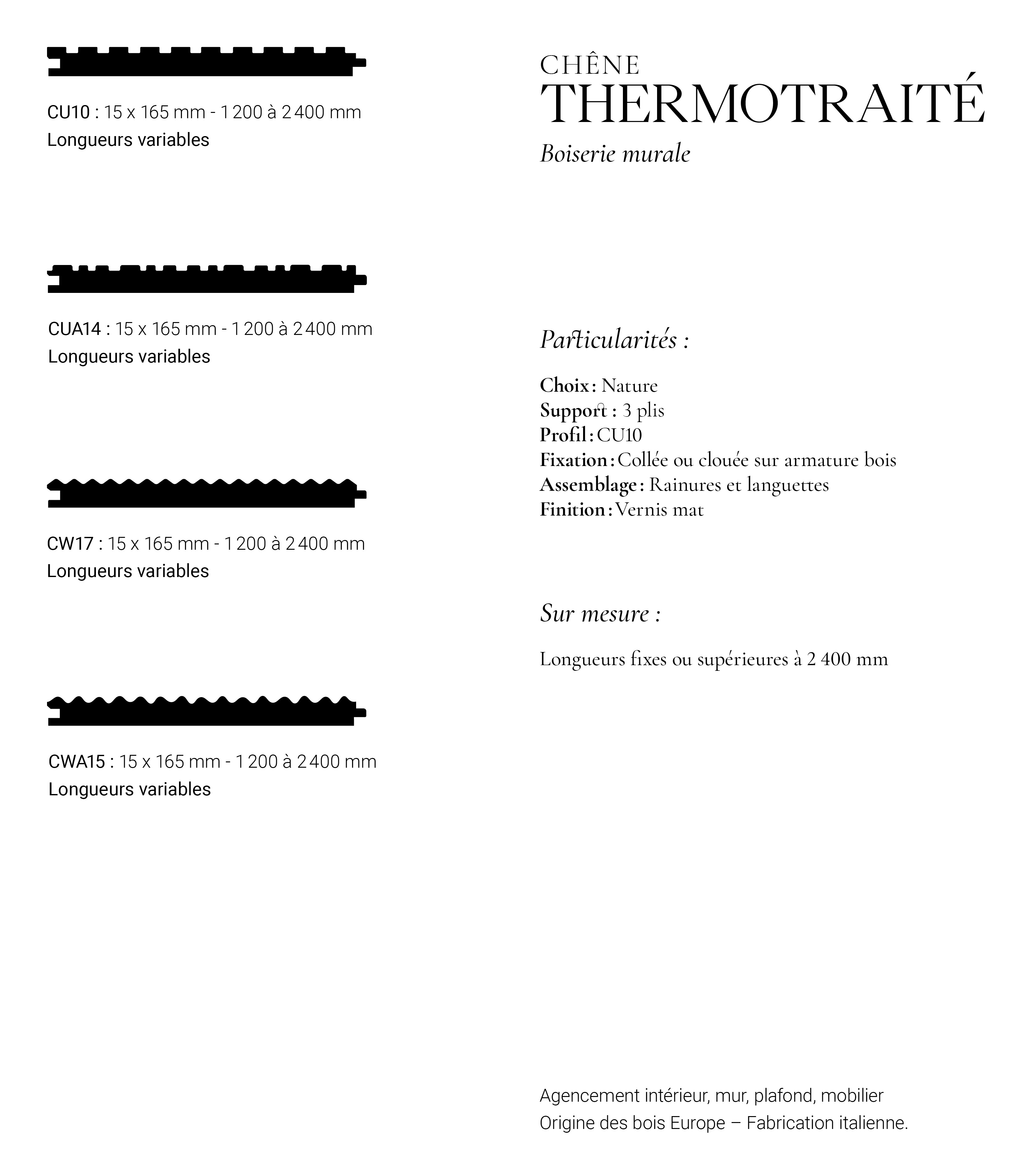Conçu à partir de Chêne Européen thermotraité, son vernis illumine le veinage unique du bois tout en lui prodiguant une protection durable.