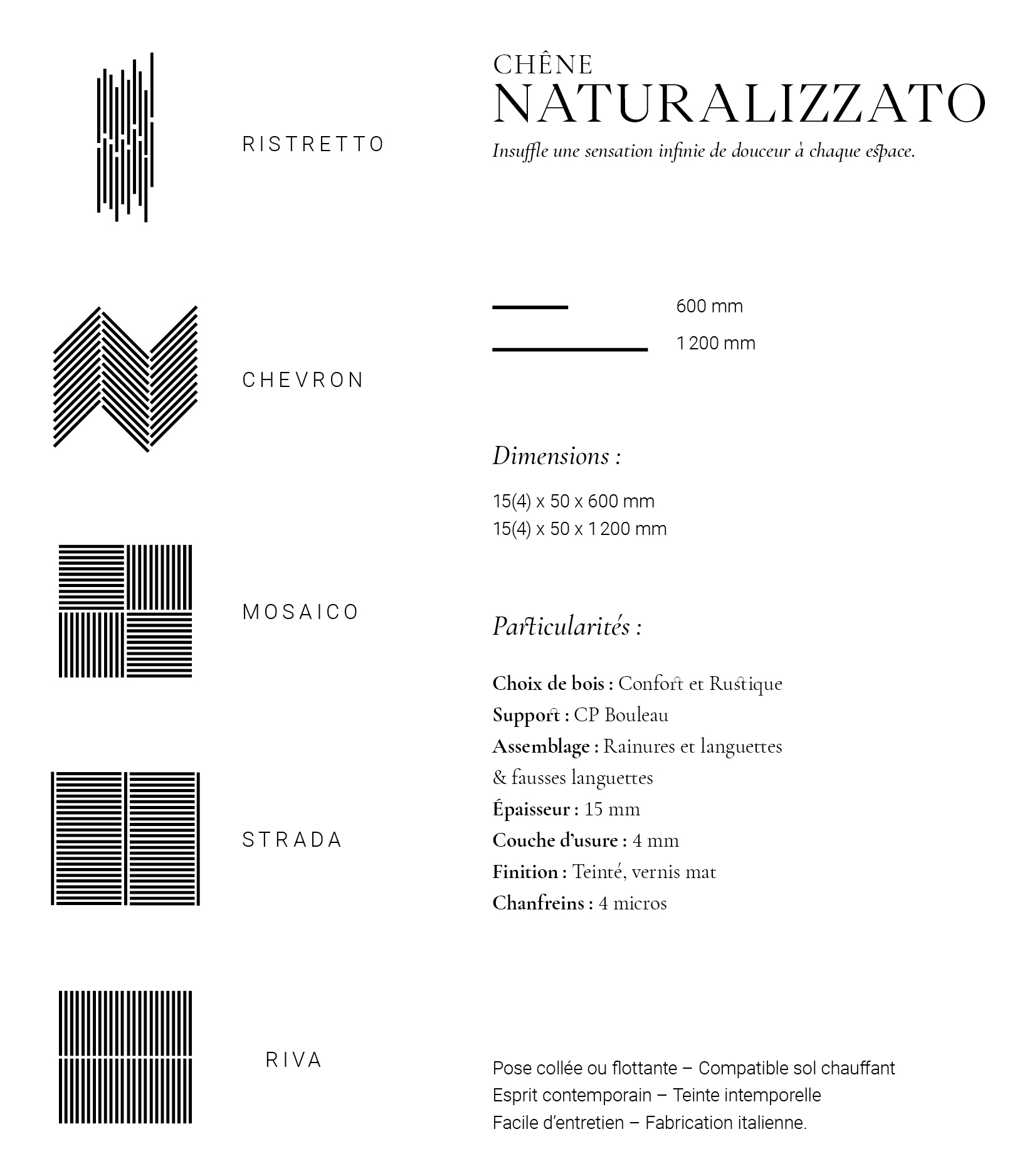 Avec une largeur de 50 mm et deux longueurs possibles : 600 et 1 200 mm, profitez d’une multitude de possibilités et exprimez votre créativité. Vos projets deviendront de véritables terrains de jeux avec nos cinq motifs de pose et nos soixante combinaisons possibles.