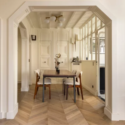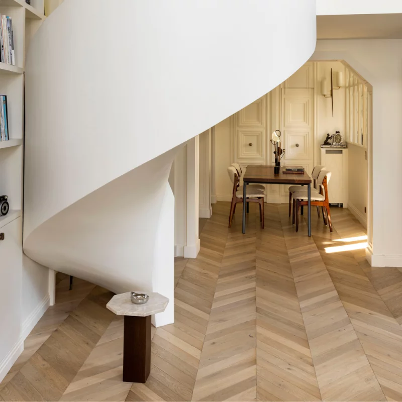 Ce Point de Hongrie, motif iconique de la parqueterie, fait littéralement vibrer les espaces avec ses grandes lames, dynamisant l’atmosphère d’une pièce. Déclinable en une multitude de motifs, jouez avec les formes, les perspectives et les rythmes en dessinant des espaces aux lignes contrastées avec notre teinte Sanibel.