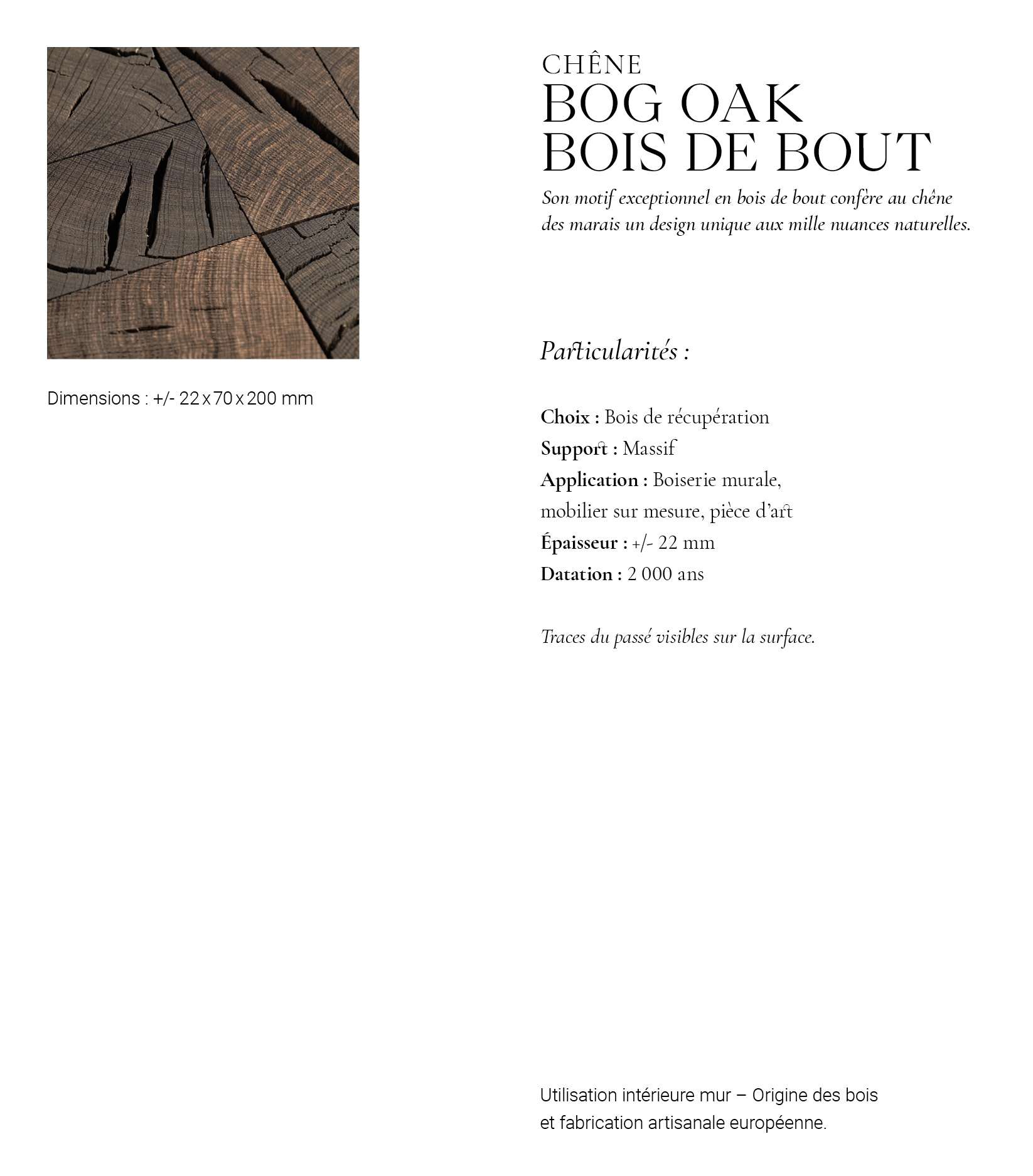 Laissez-vous envoûter par notre collection « Empreinte » laissant rejaillir les splendeurs d’un passé lointain à l’image de notre Brisure en Chêne des Marais Massif.