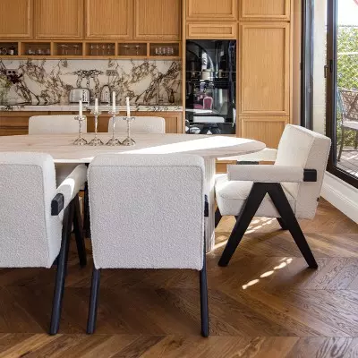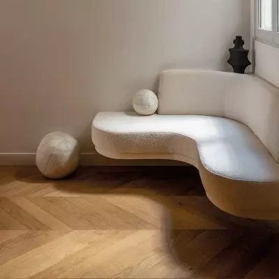 Celebrate the joy of living with our \'Vénitienne\' collection, crafted as an invitation to creativity and freedom. Our Semi-Solid Oak Montelino Chevron Wood Flooring captures the essence of la Dolce Vita—simple yet refined.