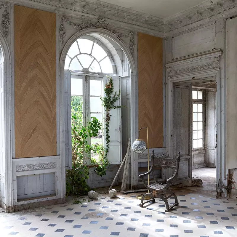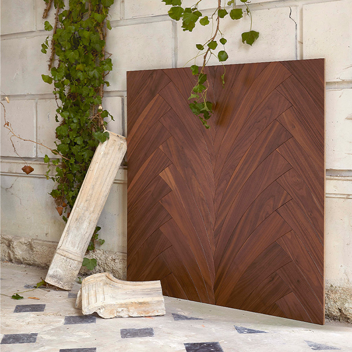 The surface responds to the light, revealing a play of shadows and textures unique to atelier marquetry. Designed for sophisticated interiors, Calypso integrates seamlessly into spaces seeking both distinction and character, blending the nobility of fine wood species with contemporary elegance.