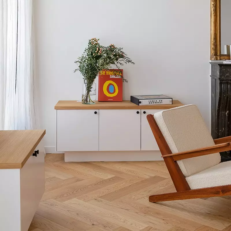 Inspired by the beauty of fleeting moments, we designed the 'Rituel' collection as an invitation to find well-being in the simplicity of everyday life. Our Solid Oak Saline Wood Flooring with its delicate mineral tones, brings a serene and light atmosphere to your interior. The artisanal brushing gives the wood a silky touch, while Its varnish finish will provide long-lasting protection against wear and scratches. Committed to preserving the environment, we engage in rigorous sourcing, prioritizing short supply chains and sustainably managed French forests.