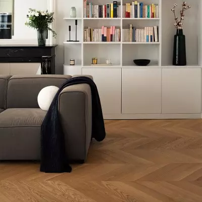 The walnut herringbone parquet is the perfect choice to dress your interiors with classic elegance, while offering a touch of natural warmth and timelessness.