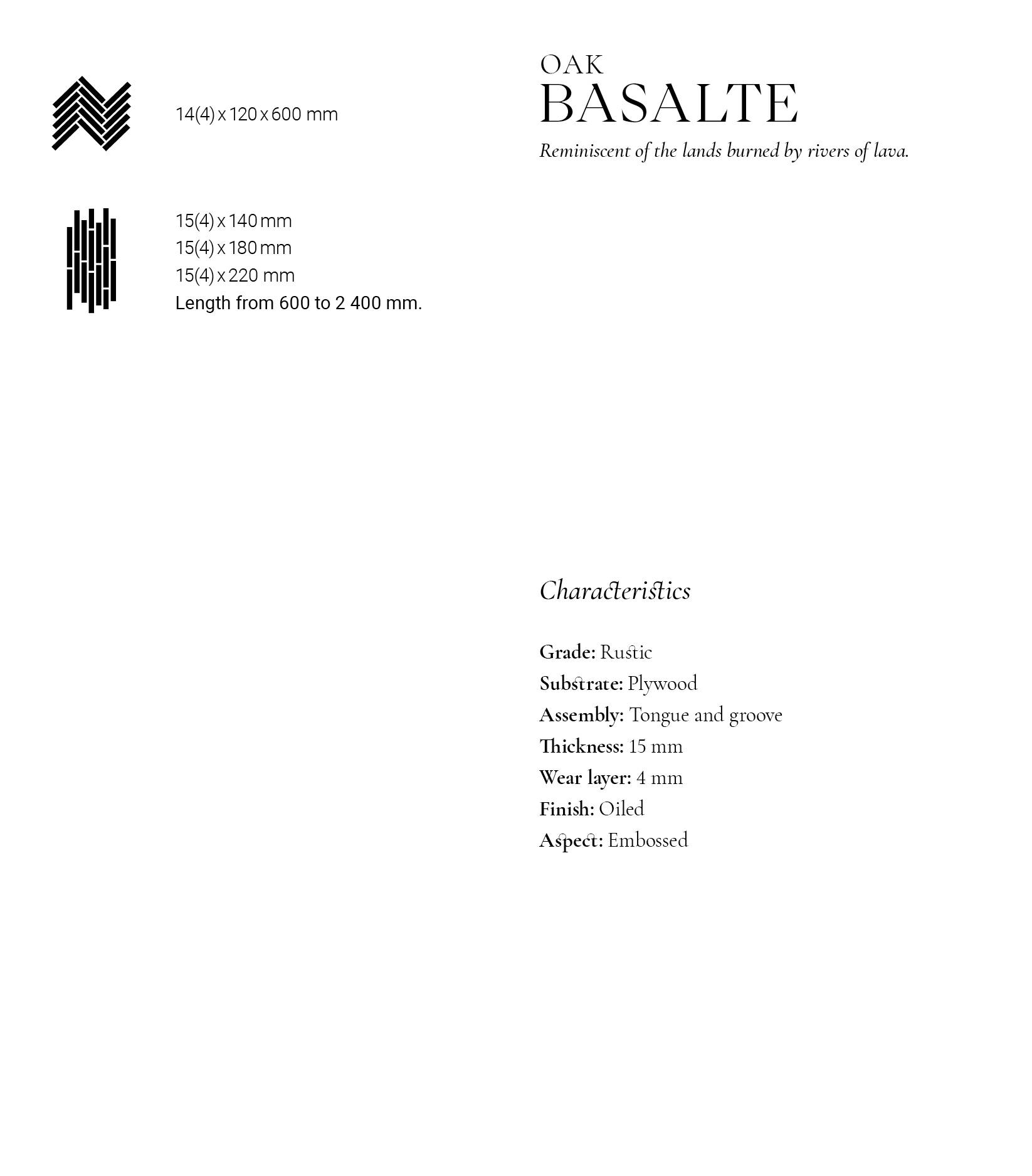 Let yourself be transported to wild lands with our "Australe" collection and our Semi-Solid Oak Basalte Parquet. Its textured lines, reminiscent of charred wood meant to be walked upon freely, extend from floor to wall.