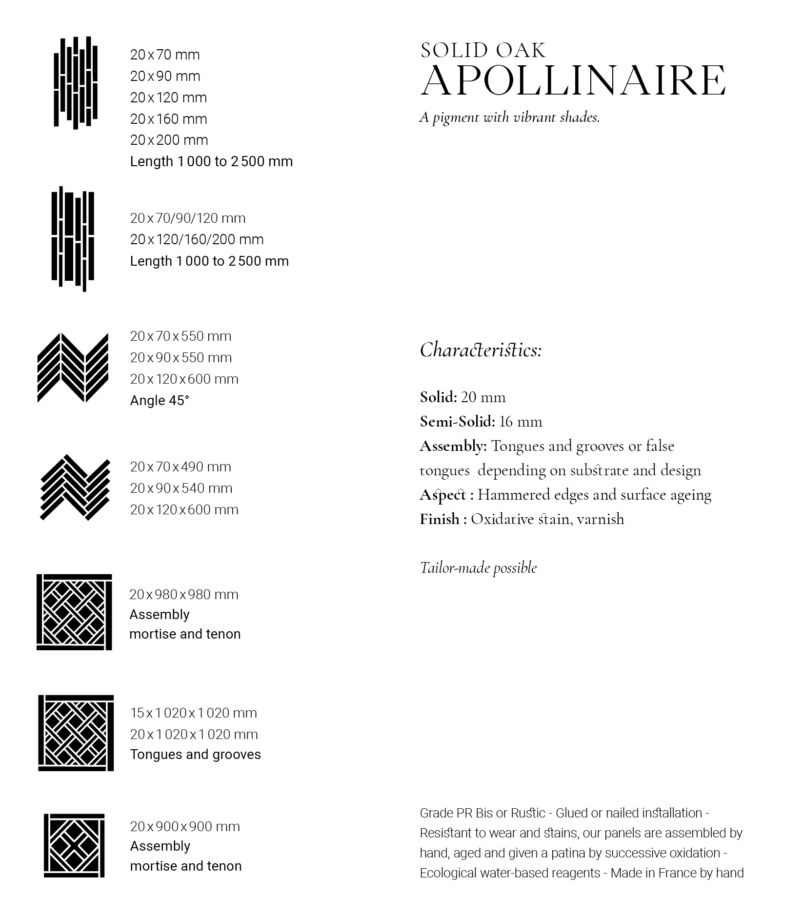 The ‘Les Authentiques’ collection and our Authentic Solid Oak Apollinaire Chevron celebrate the allure of the City of Light. Allow yourself to be transported to Paris as envisioned by writers, poets, and artists of centuries past. Our Apollinaire Chevron, with its deep-toned grayish hue, is meticulously handcrafted in our French workshops. This iconic parquet pattern evokes the grandeur of Haussmannian apartments, seamlessly blending historical elegance with contemporary interiors. The ‘Les Authentiques’ collection features planks that are aged and hand-patinated through multiple oxidations, utilizing eco-friendly, water-based treatments to enhance durability and resistance to wear and stains. The Apollinaire pigment is available in various patterns, including straight planks, Herringbone, Versailles panels, and Soubise tiles. Committed to excellence and the integrity of our materials, the ‘Les Authentiques’ collection results from rigorous sourcing, merging French craftsmanship with sustainably managed forests.