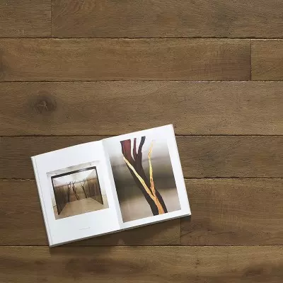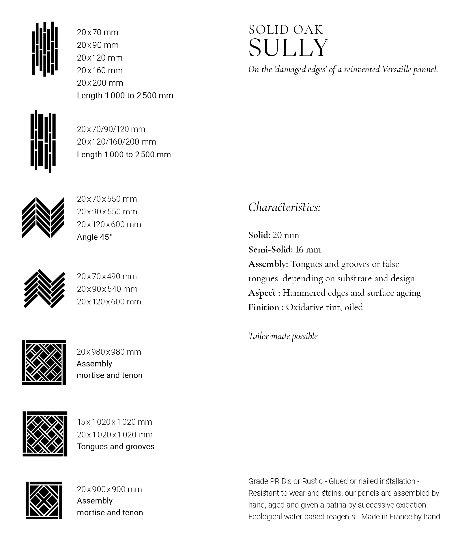 'Les Authentiques' French oak floors are hand-aged and patinated through successive oxidations, using eco-friendly water-based finishes for enhanced resistance to wear and stains. The 'Sully' pigment is available in various patterns: Herringbone, Chevron, Versailles Tile, and Soubise Tile.