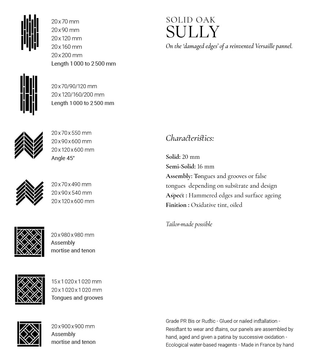 The 'Les Authentiques' collection, highlighted by our Authentic Solid Oak Soubise Pattern Sully pays homage to the City of Light. Immerse yourself in a Paris imagined by the writers, poets, and artists of centuries past. The rich, subtle hues of our Sully parquet are inspired by the legendary parquetry of the Château de Versailles. Each plank is meticulously handcrafted in our finest French workshops. As a pinnacle of craftsmanship and historical heritage in parquetry, the Soubise Panel represents the grand and opulent legacy of French design. This iconic pattern has gracefully endured through the ages, captivating generations with its timeless splendor. The planks in the 'Les Authentiques' collection are aged and hand-patinated through a careful process of repeated oxidations, using eco-friendly, water-based treatments that enhance durability and resistance to wear and stains. The 'Sully' pigment is also available in Herringbone, straight planks, Chevron, and Versailles pattern. Committed to the highest standards of craftsmanship and sustainability, the 'Les Authentiques' collection results from rigorous sourcing, seamlessly blending French artistry with responsibly managed forests.