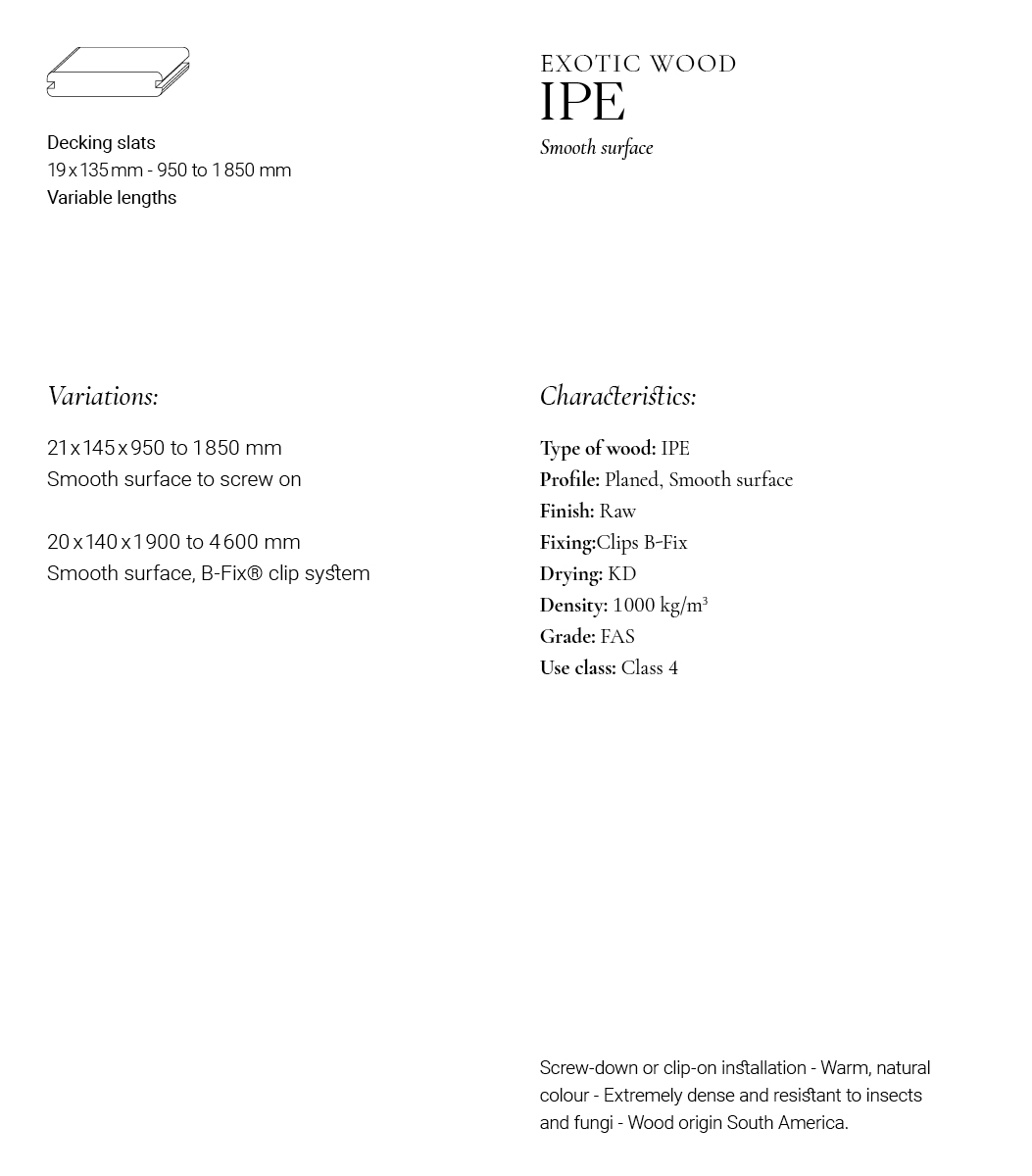 Our Ipe decking boards boast an unfinished, smooth surface that accentuates the natural beauty of the wood. The long planks create a seamless connection to the horizon, enhancing the visual appeal of your outdoor space. Kiln-dried for optimal stability, these boards are highly resistant to climate variations. You can opt for traditional installation, which ensures reliable strength, or choose the B-fix invisible clip system for a sleek, modern look. Each board is carefully selected and graded as Grade A, ensuring exceptional quality, uniform color, and a consistent, unaltered structure.