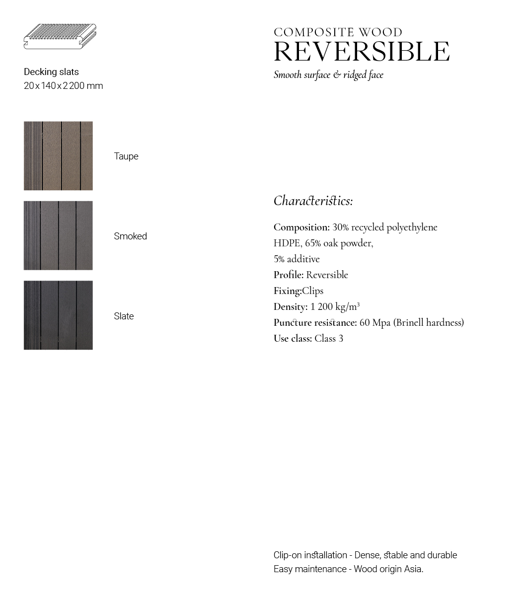 Our Smoked composite wood decking boards add a subtle elegance and a modern touch to your outdoor space. Made from high-quality composite wood, these boards are designed to offer both innovation and strength, providing resistance against harsh weather, UV rays, mold, and insects. Each WPC board features a reversible profile, engineered to endure heavy foot traffic. You can choose between a smooth or riffled surface to match your desired look for your outdoor area. Both options offer daily comfort with their anti-slip properties. These boards are crafted from recycled wood chips and polyethylene, reflecting our commitment to environmental sustainability. This eco-conscious approach ensures the product's quality and long-lasting durability.