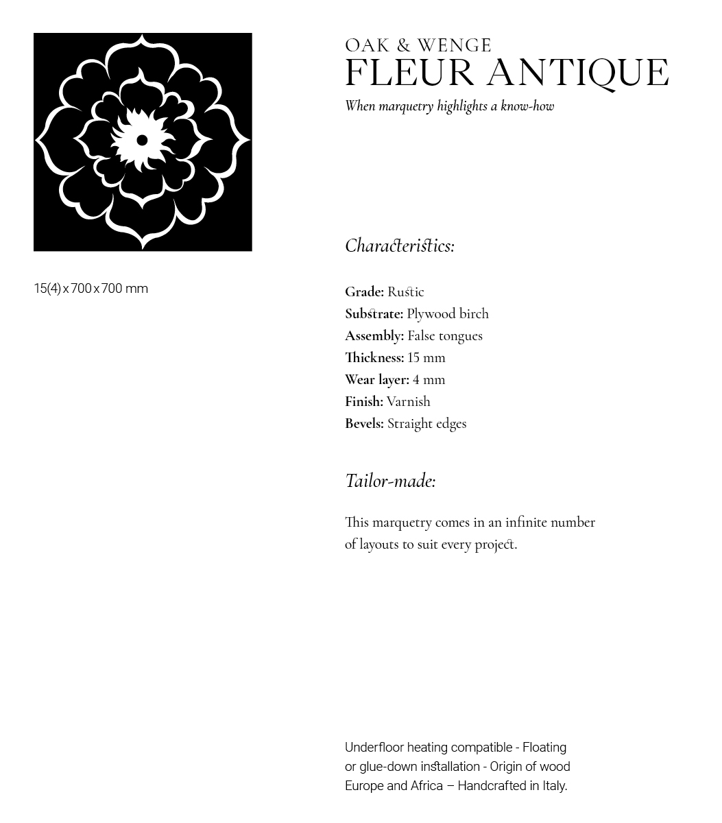 Allow yourself to be enchanted by our 'Imagine' collection, showcased by our Semi-Solid Oak and Wenge Marquetry Wood Tile, Fleur Antique. Transform material into art and reimagine traditional marquetry through the exceptional skill of our Master Artisans. Bring nature into your interiors with the floral pattern and natural tones of this exquisite marquetry, which adds distinctive and inviting graphics to your space. Handcrafted in Italy, this piece embodies our profound passion for noble materials. Committed to excellence and material provenance, we practice meticulous sourcing, blending short supply chains with sustainably managed forests.